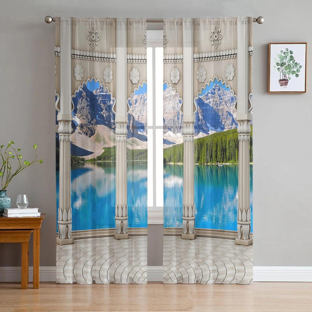 Lake Snow Mountain Forest Chiffon Sheer Curtains For Living Room Home Decoration Window Voile Tulle Curtain Drapes