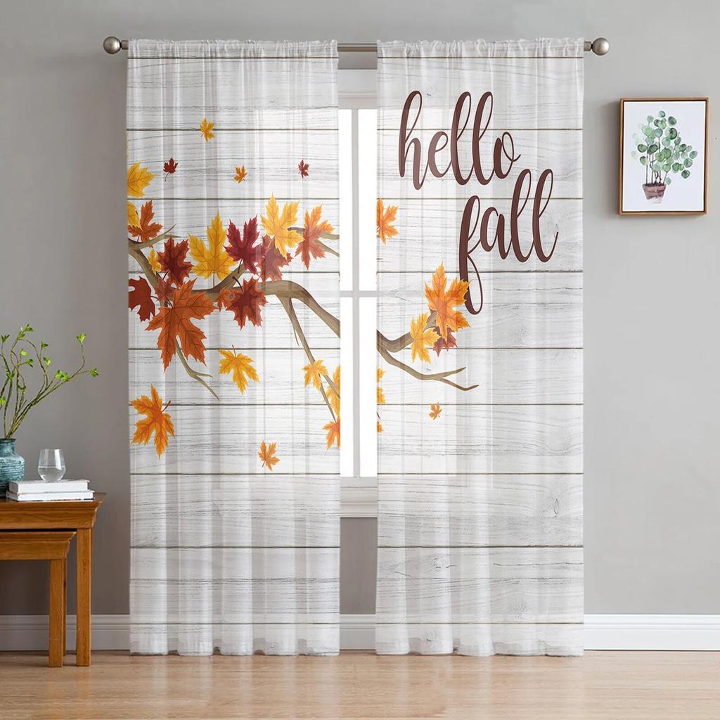 Maple Leaf Farmhouse Retro Wood Grain Tulle Curtain for Living Room Kitchen Bedroom Sheer Tulle for Cafe Hotel Modern Home Decor