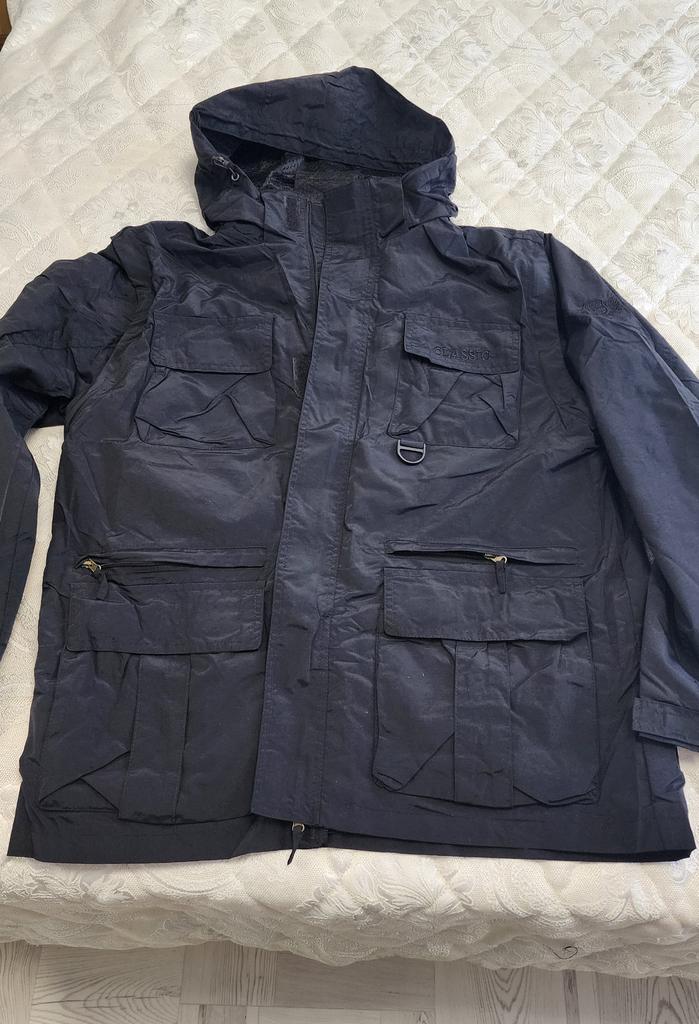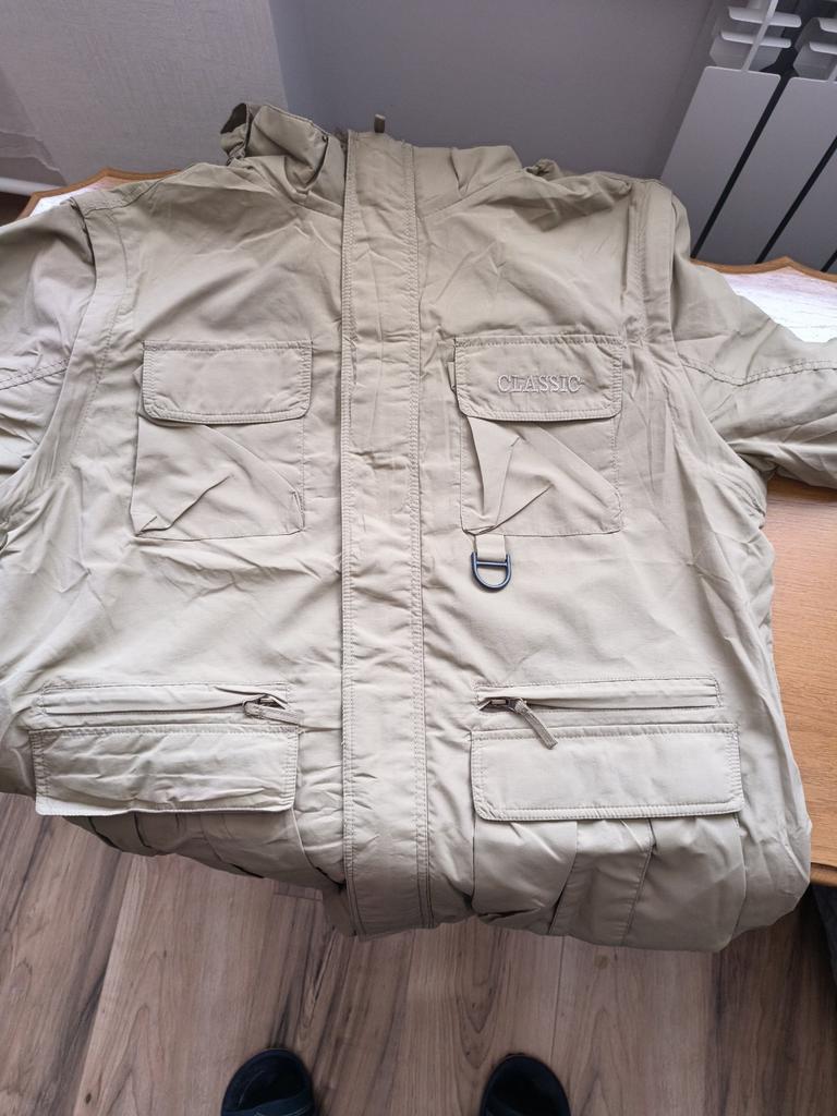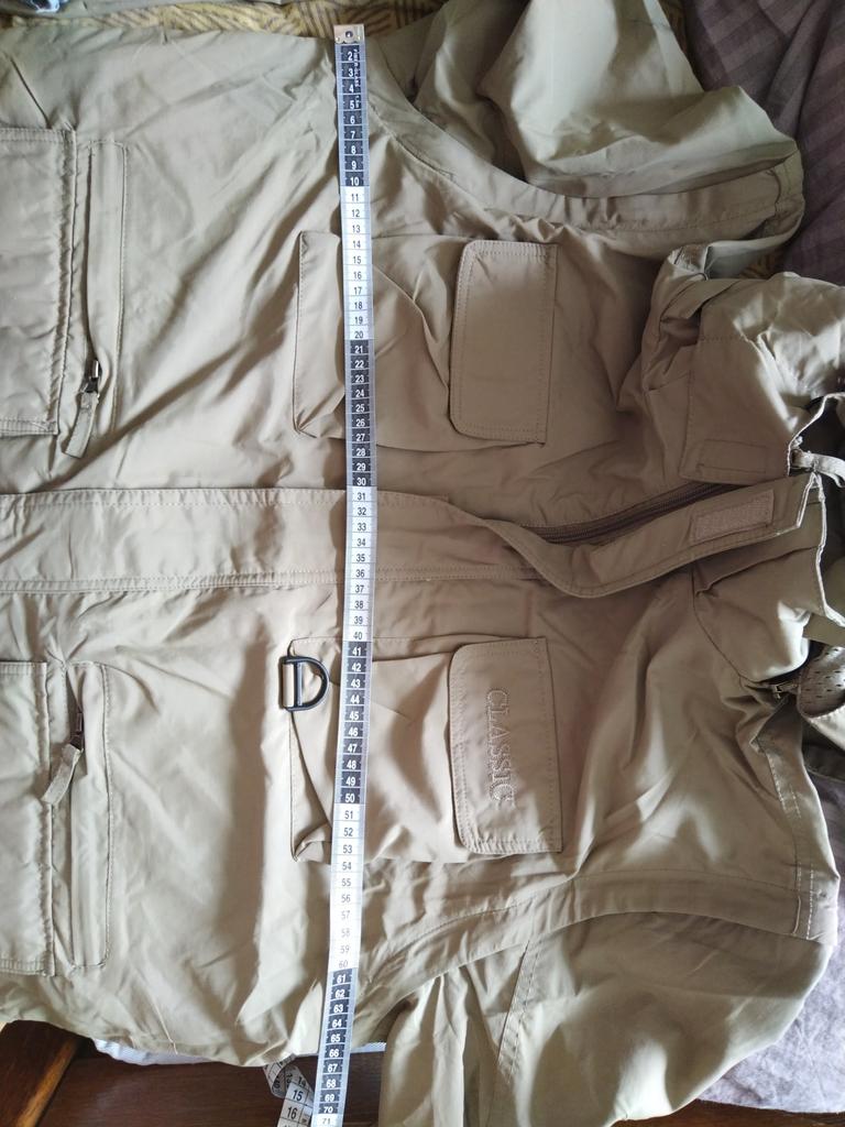Packed normally. Lightweight. With lining (including the hood). Central zipper. Placket and outer pockets with Velcro. Inner pockets with zippers.