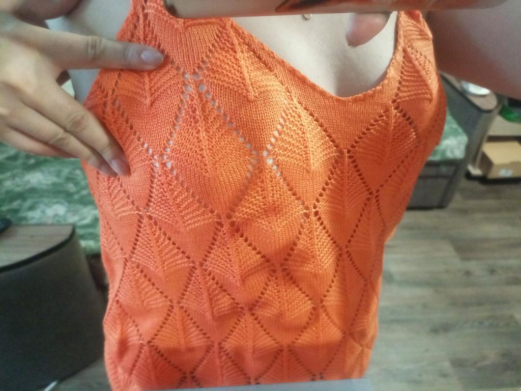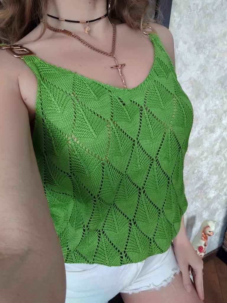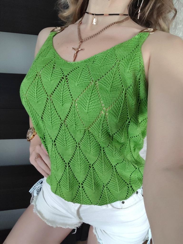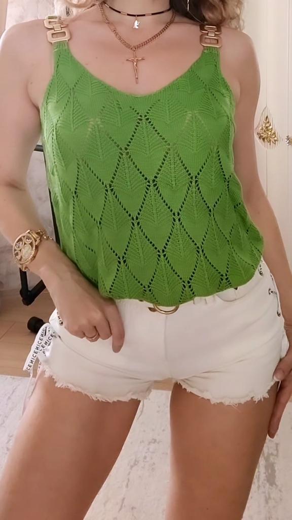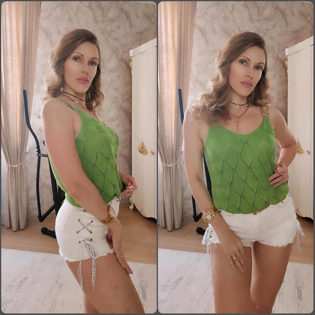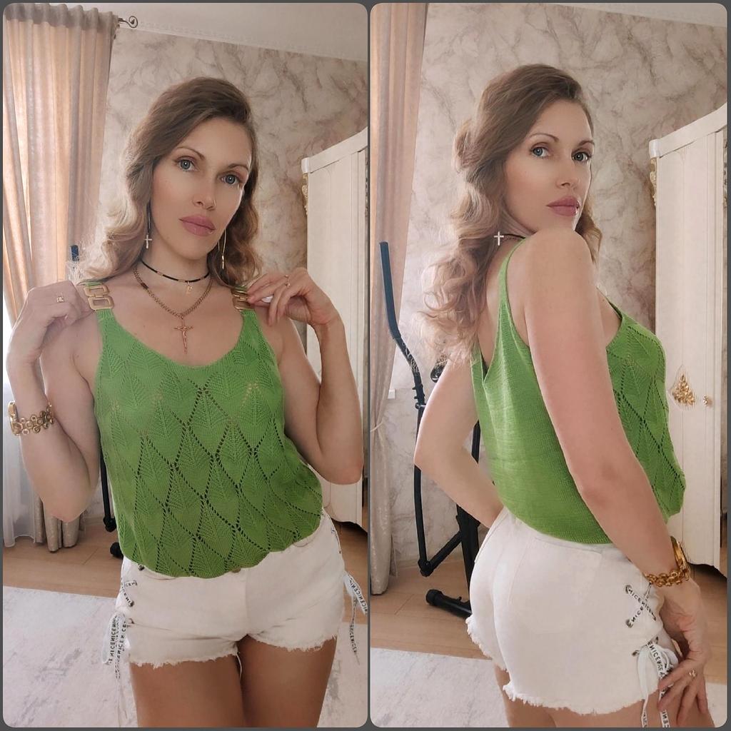 * Tank top with perforated lace and gold details* 💥𝗟𝗶𝗲𝗳𝗲𝗿𝘇𝗲𝗶𝘁 20 days 💥𝗟𝗶𝗲𝗳𝗲𝗿𝘂𝗺𝗳𝗮𝗻𝗴 The delivery includes 1 top in the corresponding color and size. The top is available in 5 different colors (white, green, khaki, orange and red) in sizes S to XL. I ordered it in size S in white. I wear size 36 to 38. I weigh 62 kg over 172 cm. Cup size 75D. Unfortunately it is still a little too big for me. 💥𝗤𝘂𝗮𝗹𝗶𝘁ä𝘁 The top is not completely opaque, which is what we wanted, thanks to the perforated lace. The top is very stretchy. The front has a different hole pattern than the back. The top is cut a little wider and falls loosely. The golden detail on the straps is a particularly elegant eye-catcher. ✨ For material composition : 100% viscose and therefore very pleasant on the skin 💥𝗙𝗮𝘇𝗶𝘁 Pretty summer top with subtle lace. I recommend wearing a skin-colored bra underneath. ....but the disadvantage is that it is slightly transparent, which is of course intended (see photos and video).. It's better to order it one or two sizes smaller.