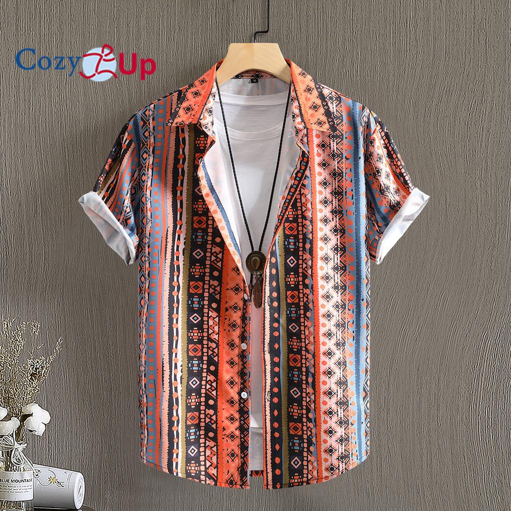 Men Short Sleeve Shirt Orange Vertical Stripe Printed Fashion Men Summer Shirt