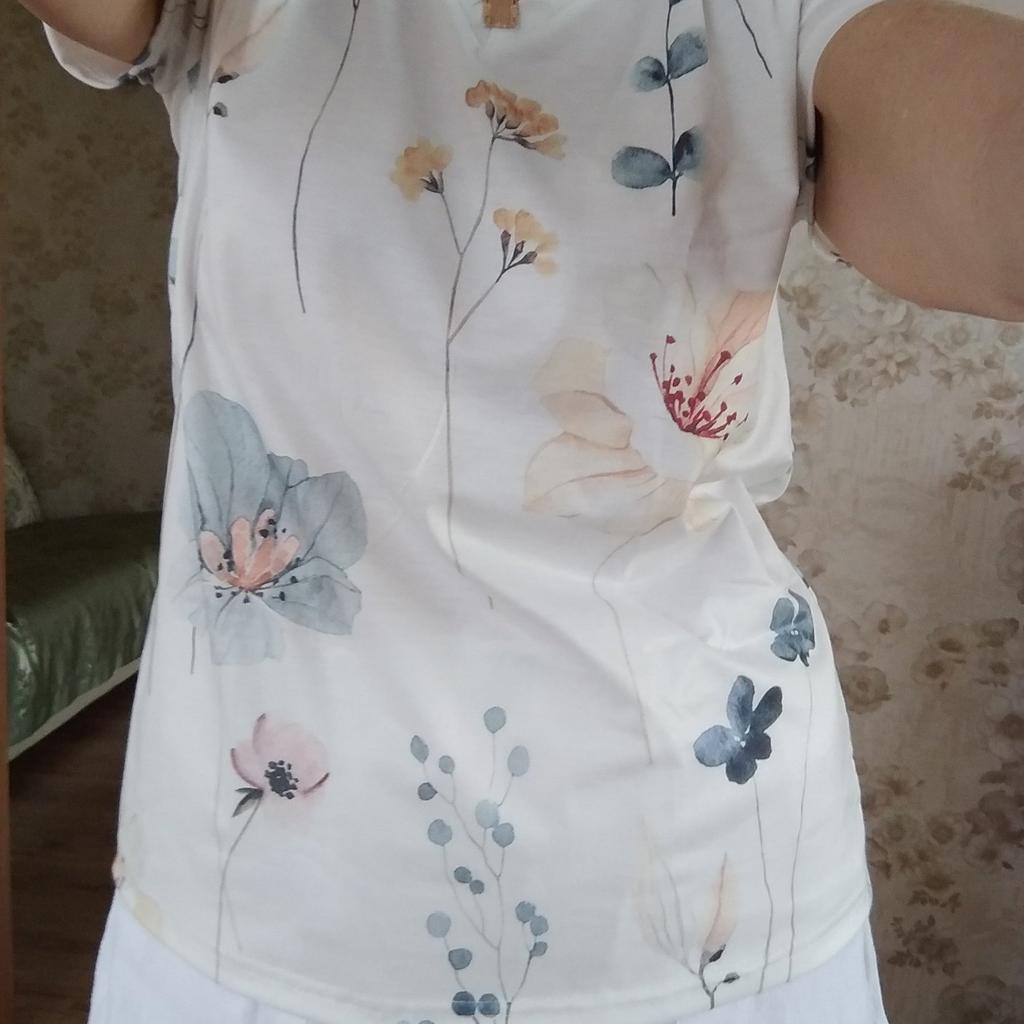 The t-shirt is cute. The size corresponds to the one indicated in the table. But the sleeve is not like in the photo, but an ordinary short one, like on all t-shirts, but this doesn't spoil the appearance.