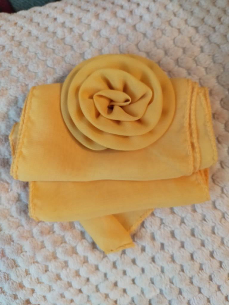 The scarf is not bad but the photo does not match, a narrow strip of yellow material arrived and a separate flower with a clothespin, but the idea is not bad, if you have hands that grow from where they need to, you can make a wonderful scarf.