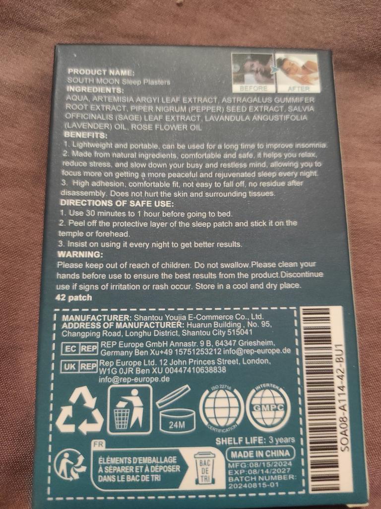 Maybe it's self-hypnosis, but it really helps me fall asleep faster and sleep more soundly. I'm taking it for the first time. I stick one on my temple 30 minutes before sleep, and remove it in the morning.