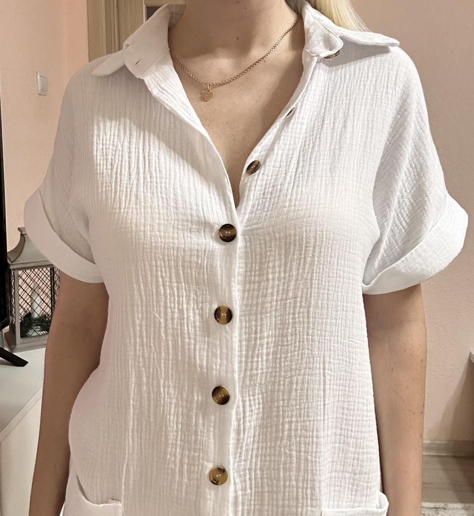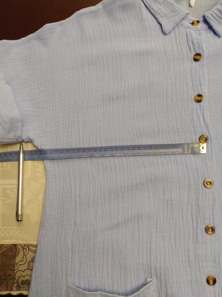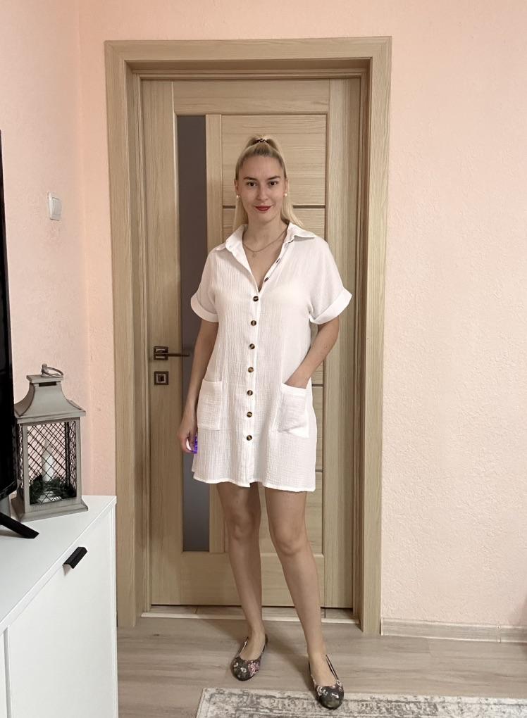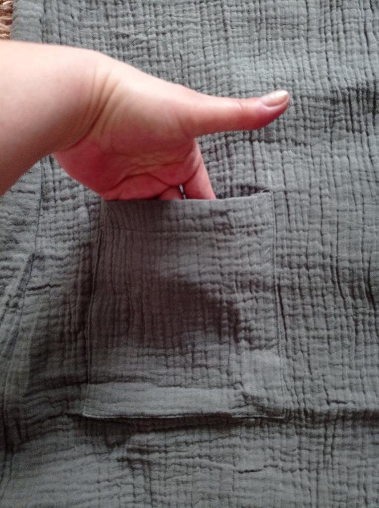 Robe is purely for the beach, as it was bought. Size S fit size 44. Didn't like the dark, ugly buttons on the white coat. The pockets were sewn on very low, I had them moved. The fabric is not very pleasant, crumpled. You need to read about the product carefully when you buy it.