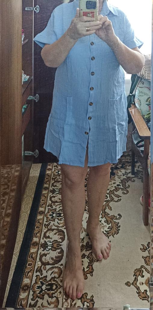 The quality of the fabric is not very good. I took it for work, but I will wear it on vacation at sea. Just a dressing gown, short, although I took XXXL specifically so that it would be a little bit looser. I wear my size 50