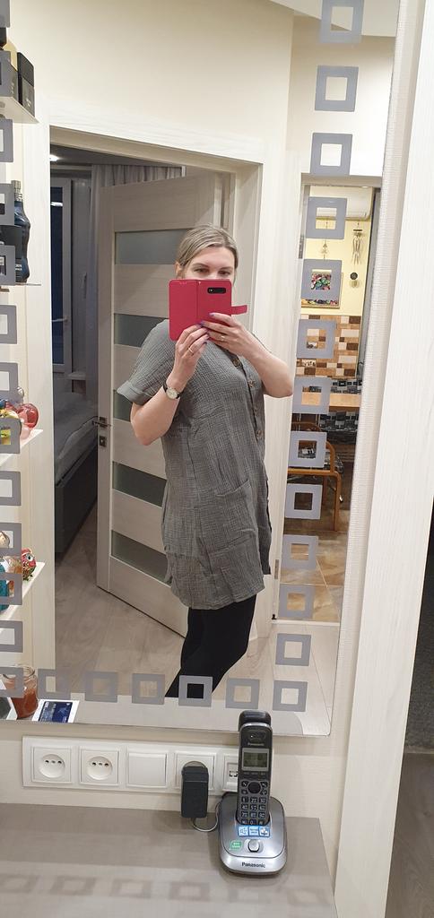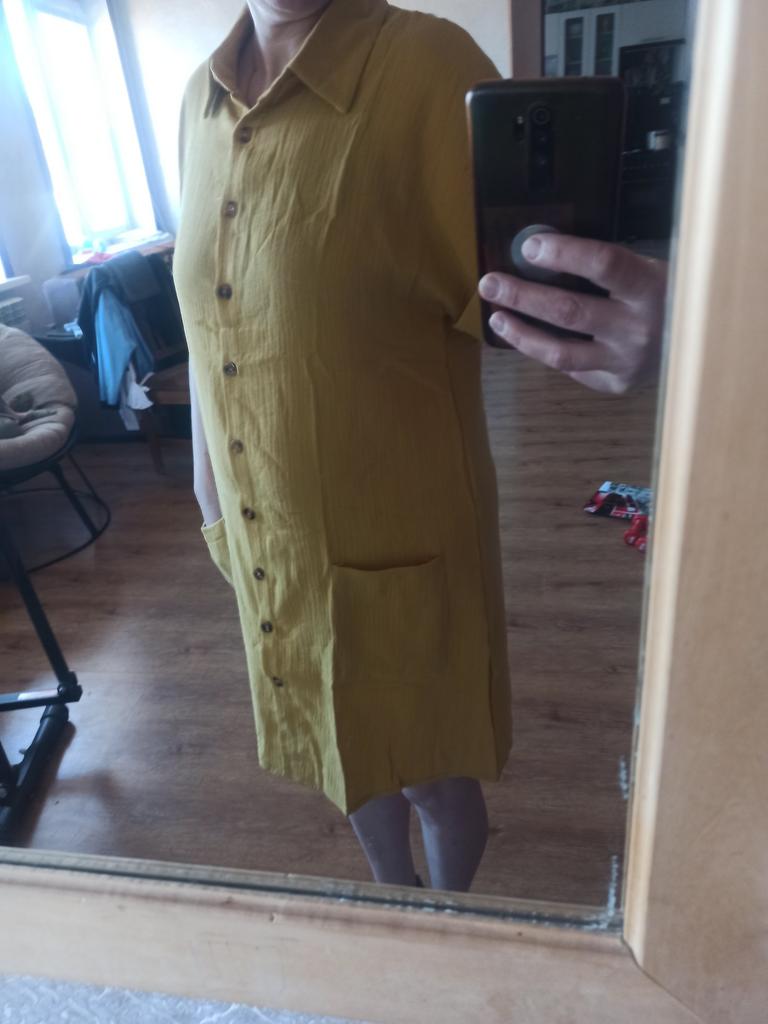 The dress is not bad, the material is nice, but it is short, maybe it is normal for young people, but for me another 5 centimeters would be good, I will have to cut it off and wear it with leggings, for my 54, two X's are normal, loose