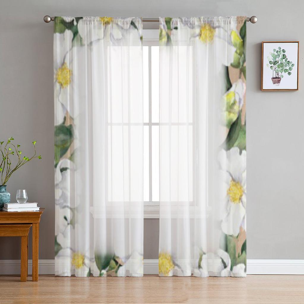 Floral White Flowers Magnolia Chiffon Sheer Curtains for Living Room Bedroom Kitchen Decoration Window Voiles Tulle Curtain