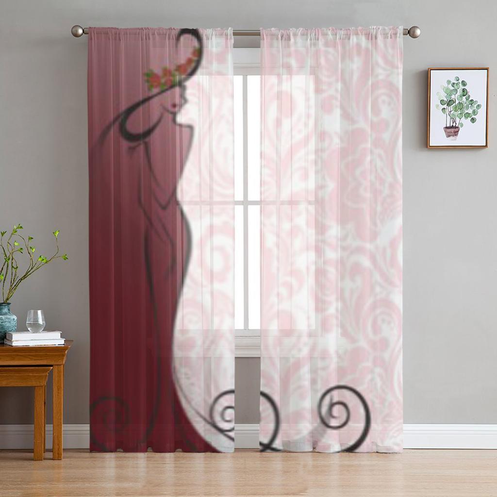 Silhouette Slender Woman In A Long Dress And Hat Floral Chiffon Sheer Curtains Living Room Bedroom Window Voiles Tulle Curtain