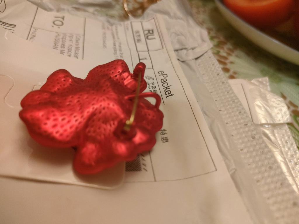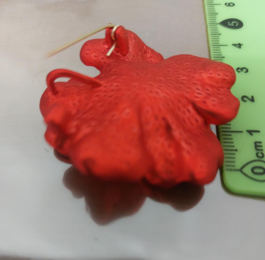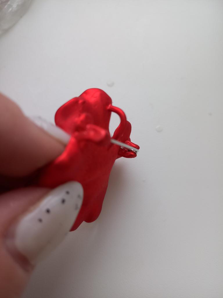 Quite large, heavy, has an eyelet, so can be worn as a pendant. Made qualitatively, the red coating is very pleasant to the touch.