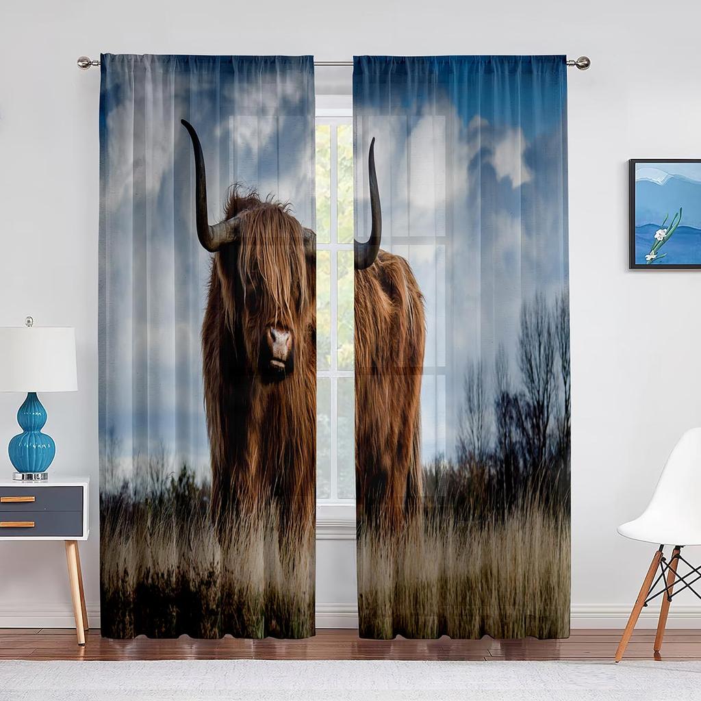 Highland Cow Sheer Voile Curtain Farmhouse Western Cattle Bull Window Tulle Curtains for Living Room Bedroom Kitchen Decoration