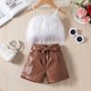 Girls Furry Suspender Top Solid Color + Leather Shorts Suit with Belt Children Clothing Feather Strap Crop Shirt 2pcs Sets