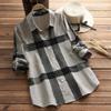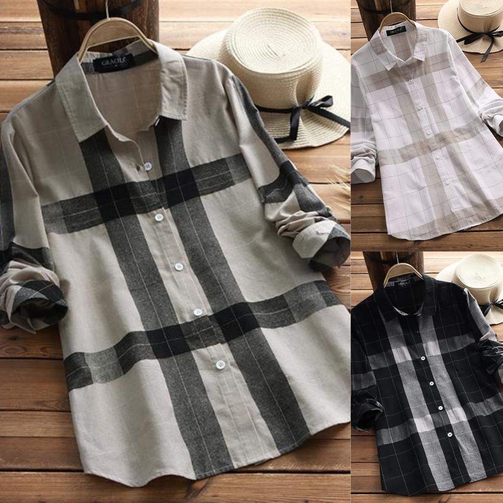 Women Spring Long Sleeve Plaid Casual Loose Lapel Turn Down Collar Blouse Tops