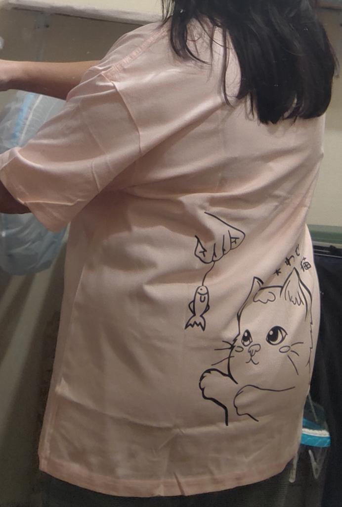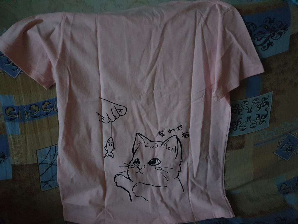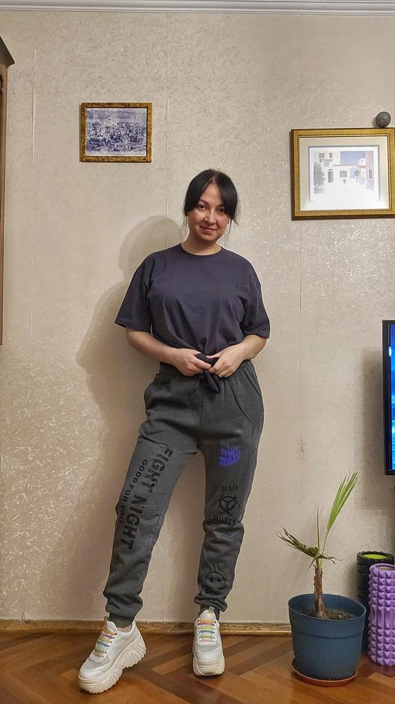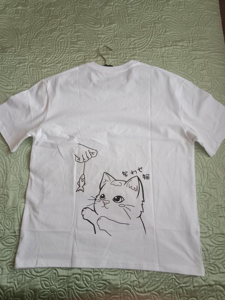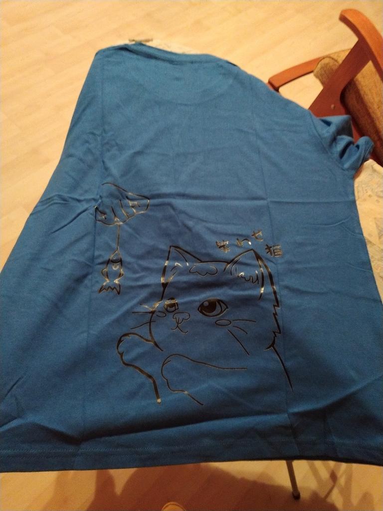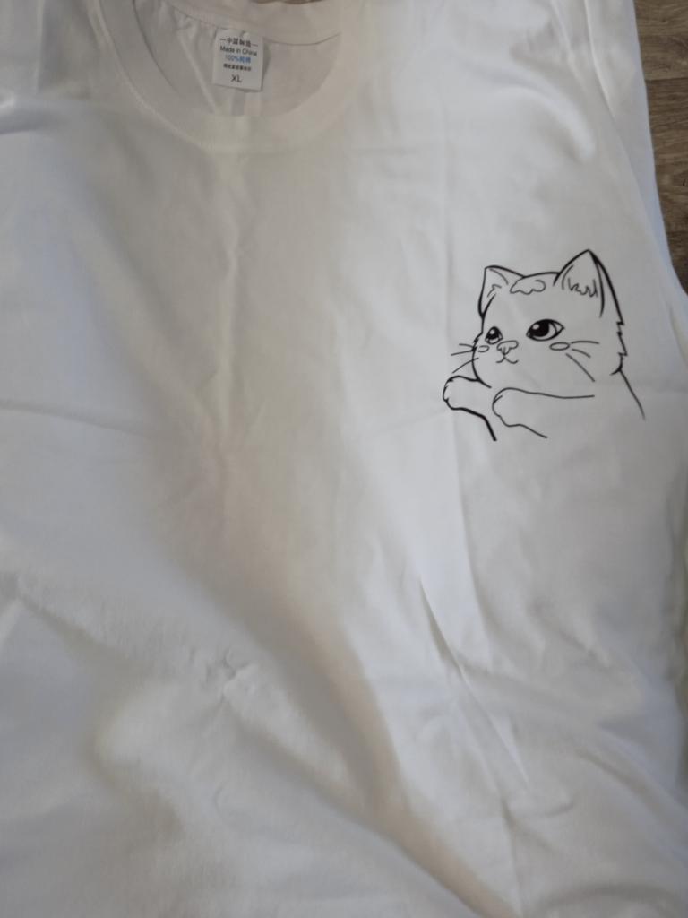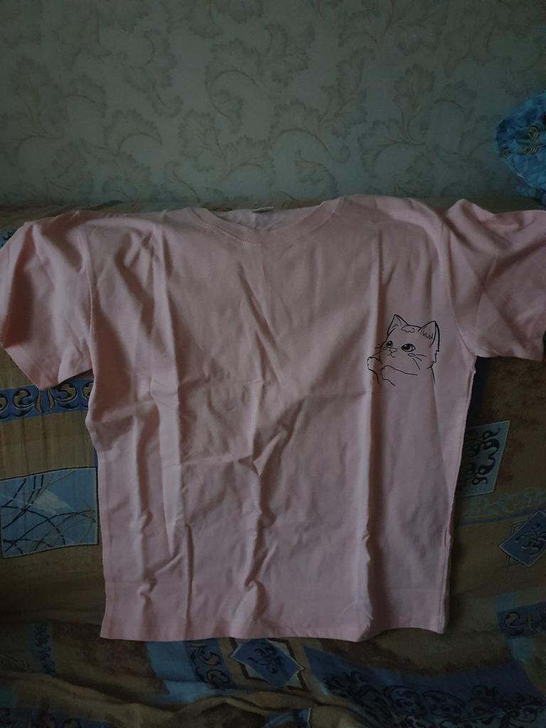 Cotton T-shirt. I specifically took oversize. It looks that way. Measurements in the photo. Very cute cat, sticker. Life will tell how long it will last.