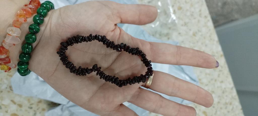The stones are small, not like garnet (I didn't expect natural ones for that price). I wanted to match them with beads made of natural garnet. It looks beautiful in the picture. The elastic is tied tightly in 2 places (they stick out, it's not pretty), it doesn't look good. I don't recommend a garnet bracelet.