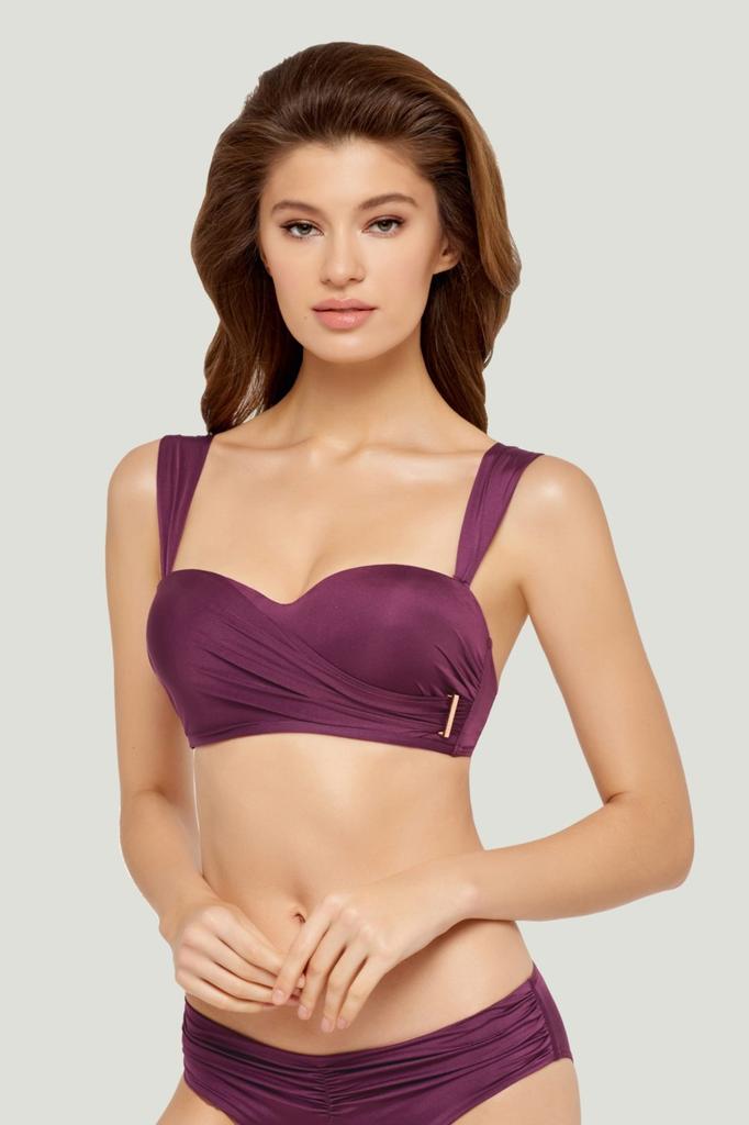 Molded bandeau cup with frame support and built-in push-up. Asymmetrical draping, metal accessory on the side. Wide removable straps, clasp on the back.