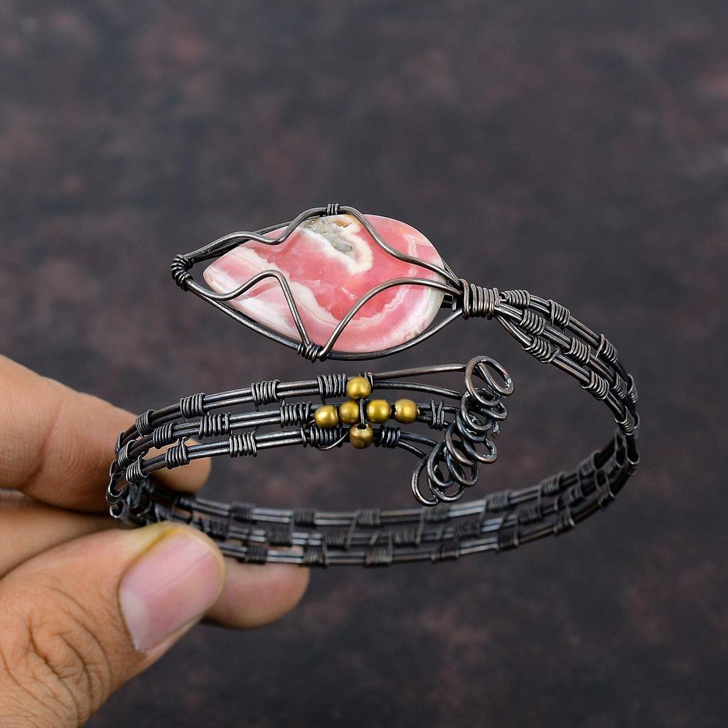 Rhodochrosite Copper Bangle Wire Wrapped Cuff Bracelet Adjustable Bangle Handmade Jewelry Gemstone Bangle Copper Wire Wrap Jewelry For Gift