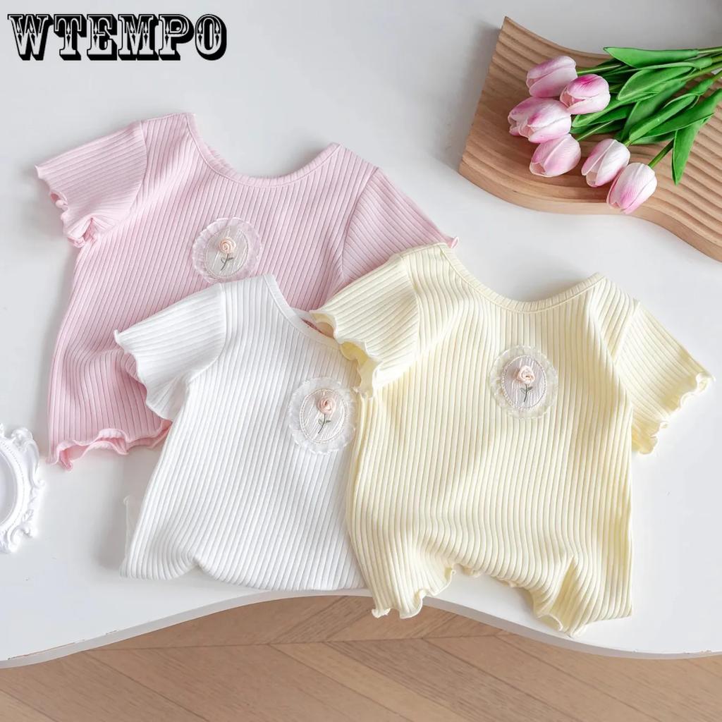 Girls Thin Short Sleeve T-shirt Summer Sweet Princess Flower Solid Color Half Sleeve