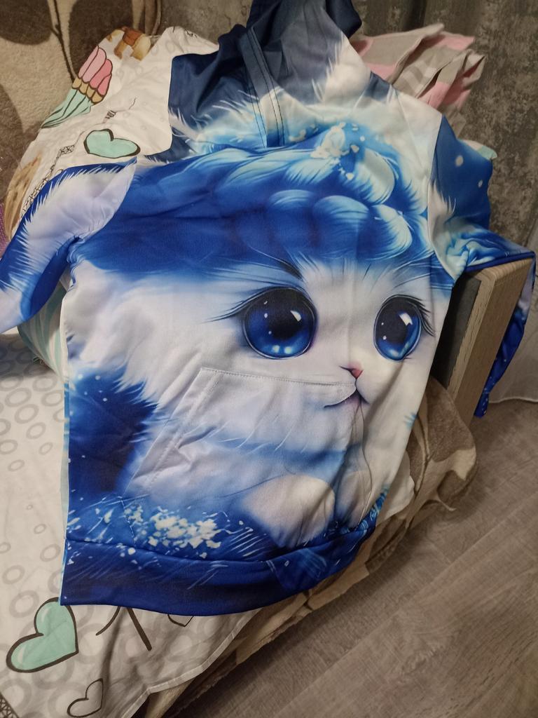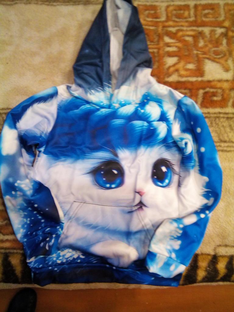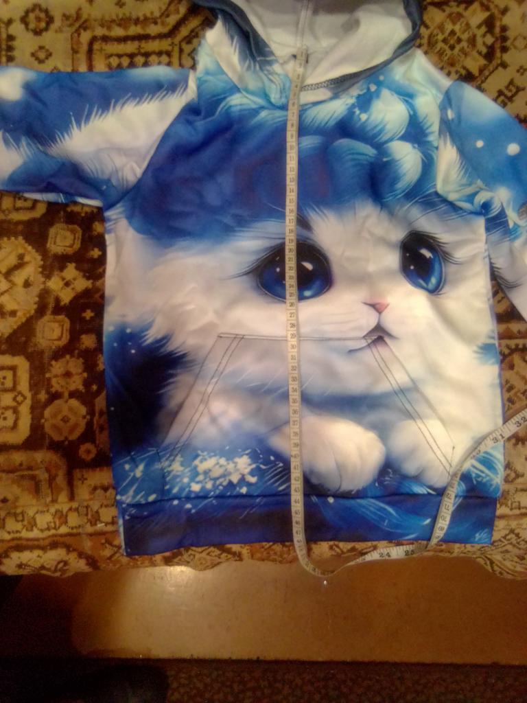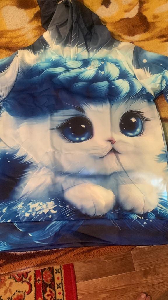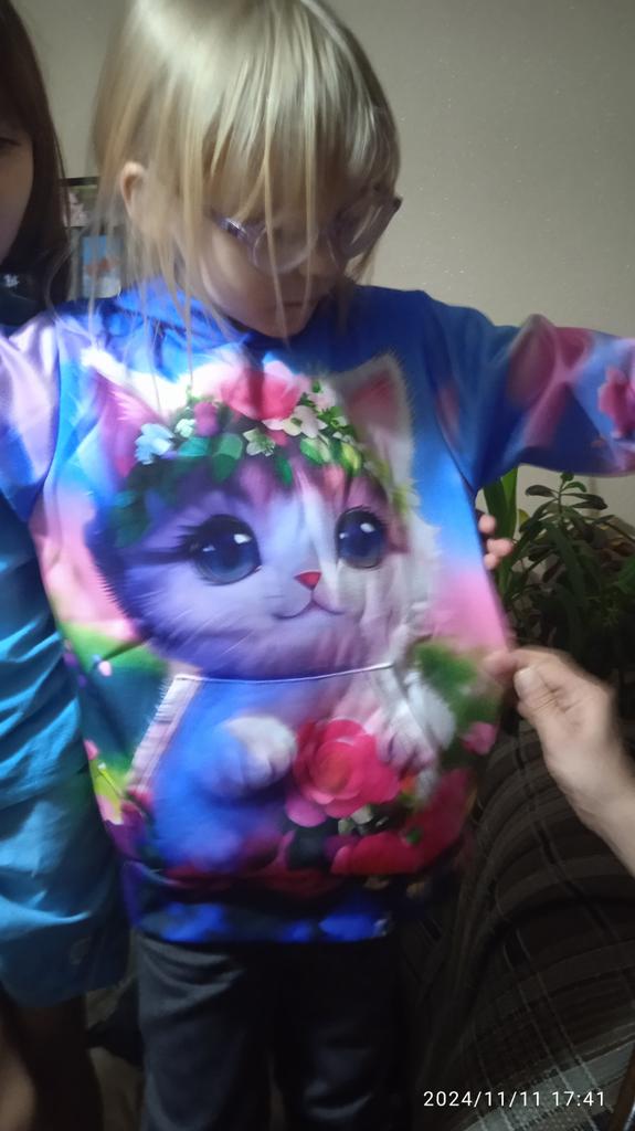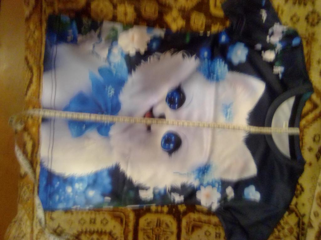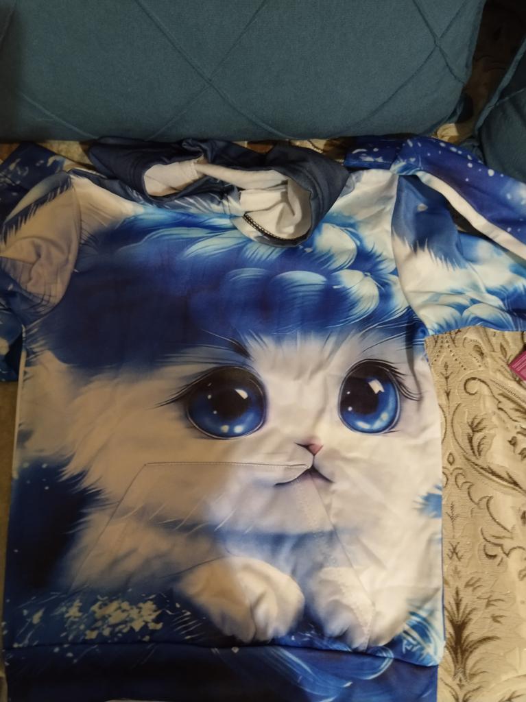 The color differs from the photo, In the photo it's blue and white, but on the blouse there is a lot of blue. And the kitten's eyes are close-up, but the white paws are not visible. It's disappointing, because we wanted it like in the photo