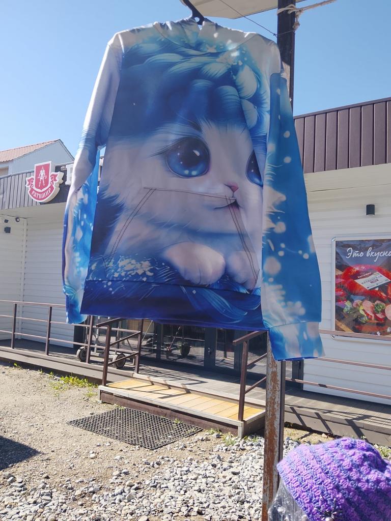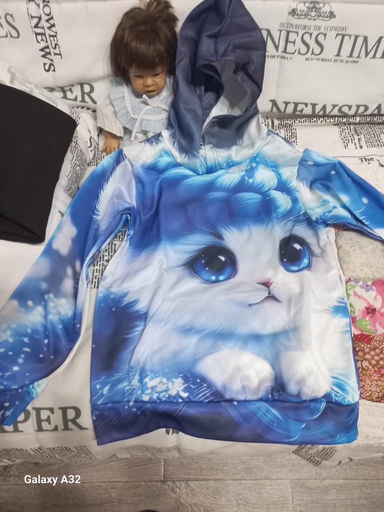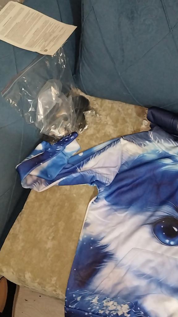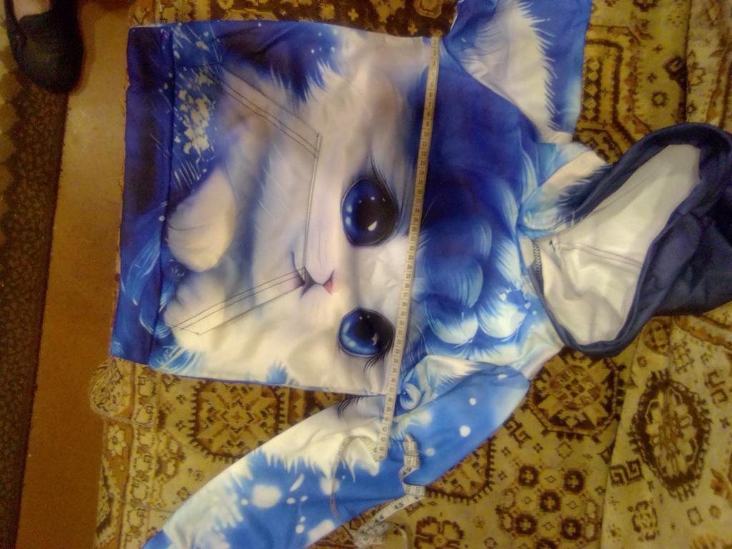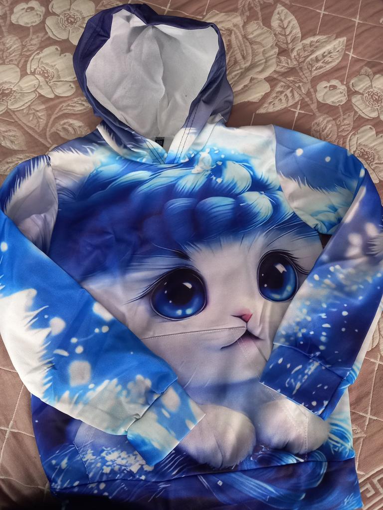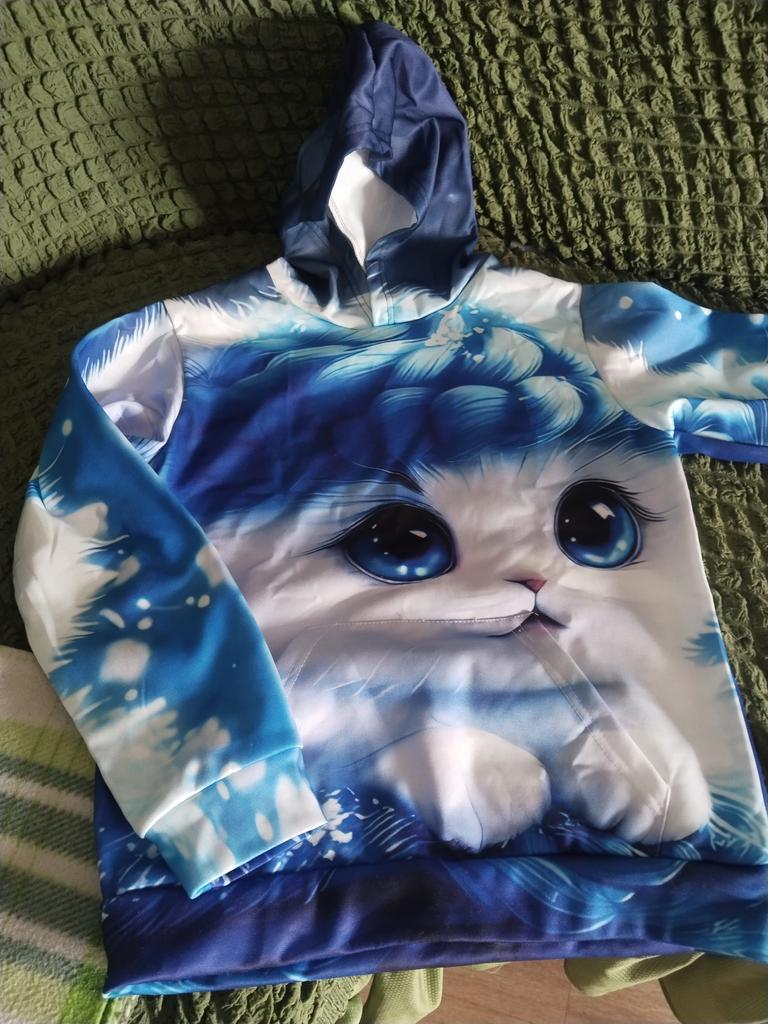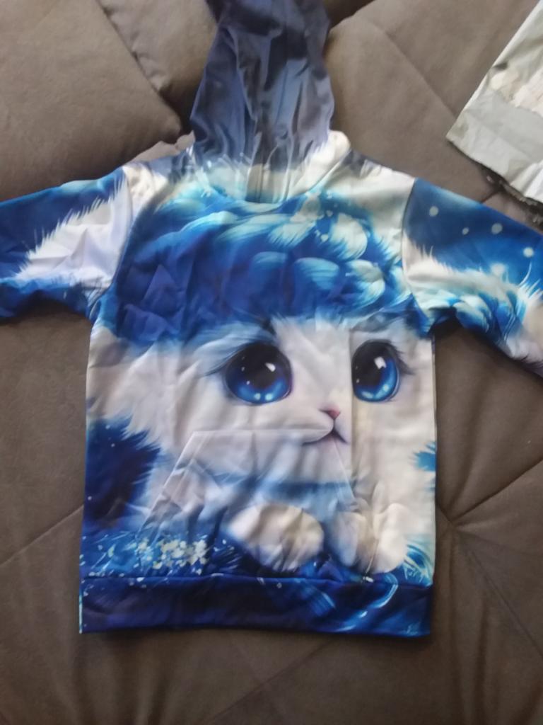 The color differs from the photo, In the photo it's blue and white, but on the blouse there is a lot of blue. And the kitten's eyes are close-up, but the white paws are not visible. It's disappointing, because we wanted it like in the photo