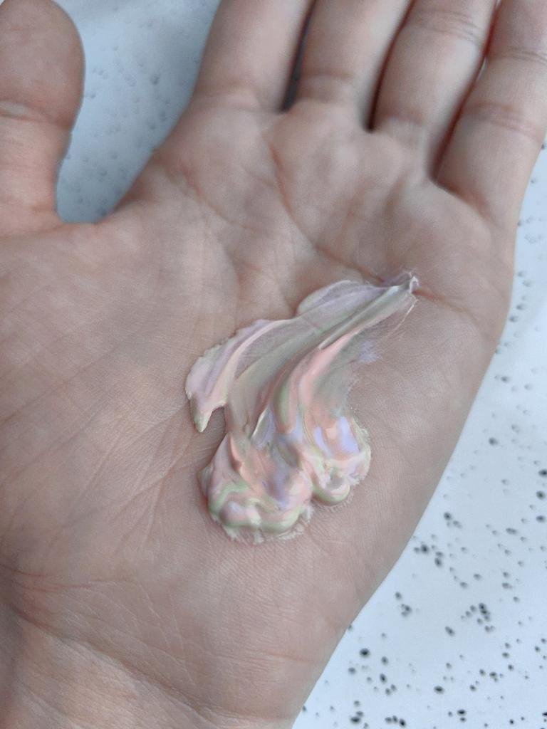 A very interesting makeup base. When three colors are mixed, a solid light pink is obtained.. Lies on the face evenly, has a velvety texture and a pleasant smell.
