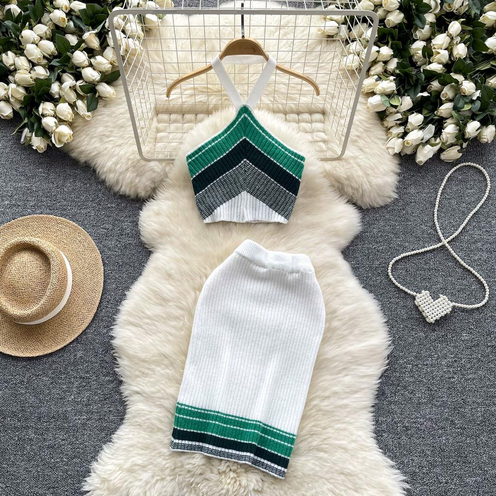 Summer Women Sexy Knitted Striped Sweater Halter Tops Vest and Mini Short Bodycon Sheath Skirt Two Piece Set