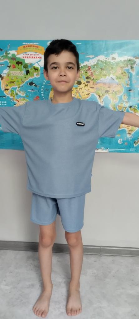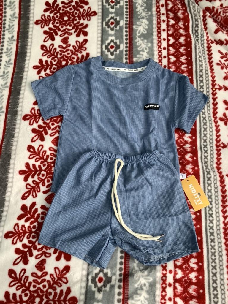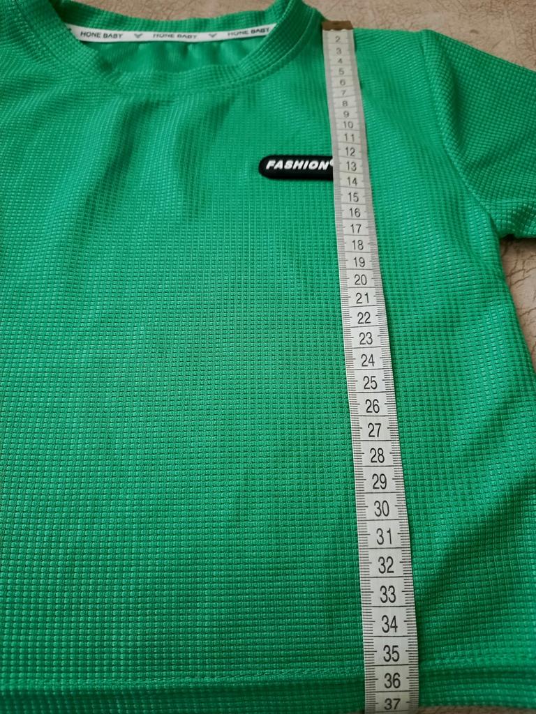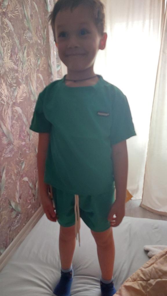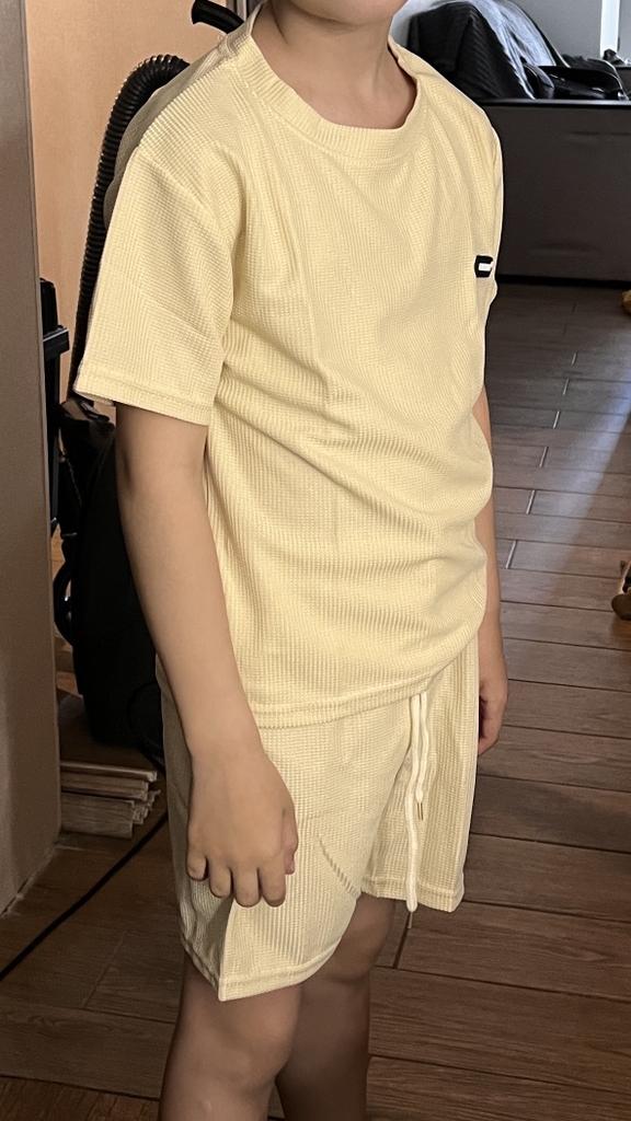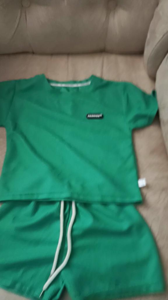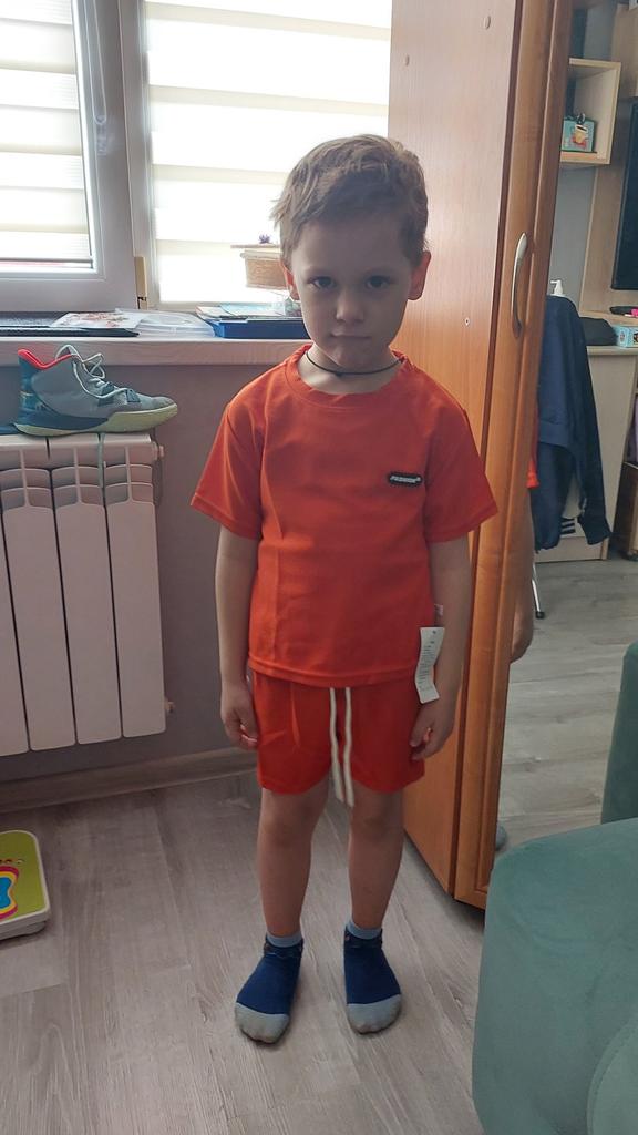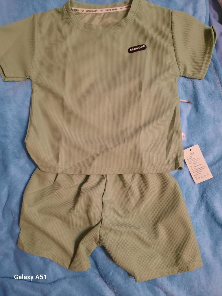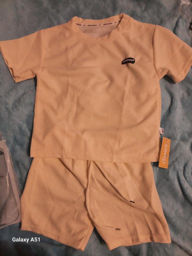 The set consists of a t-shirt and shorts, but the t-shirt fits the size, while the shorts are almost two sizes smaller. I had to add inserts on the sides of the shorts like stripes.