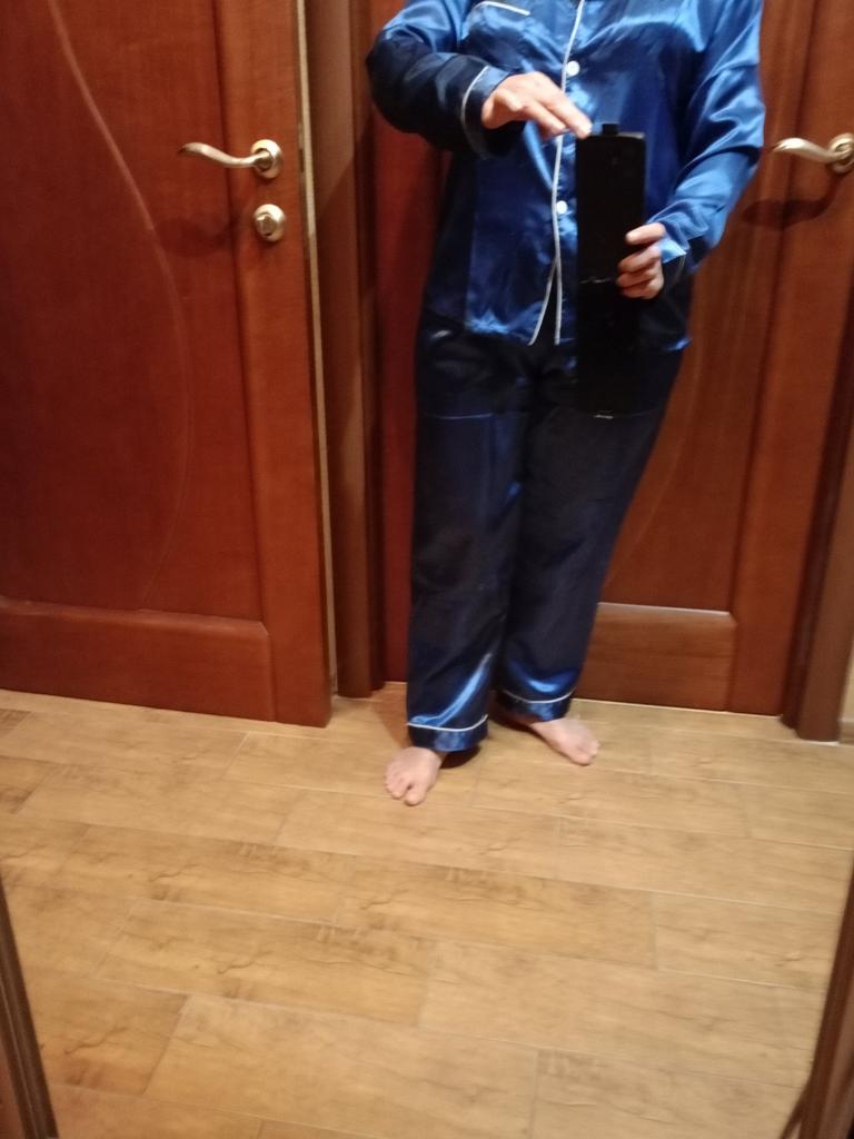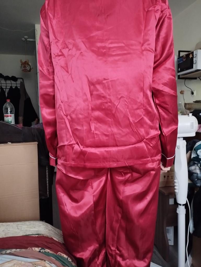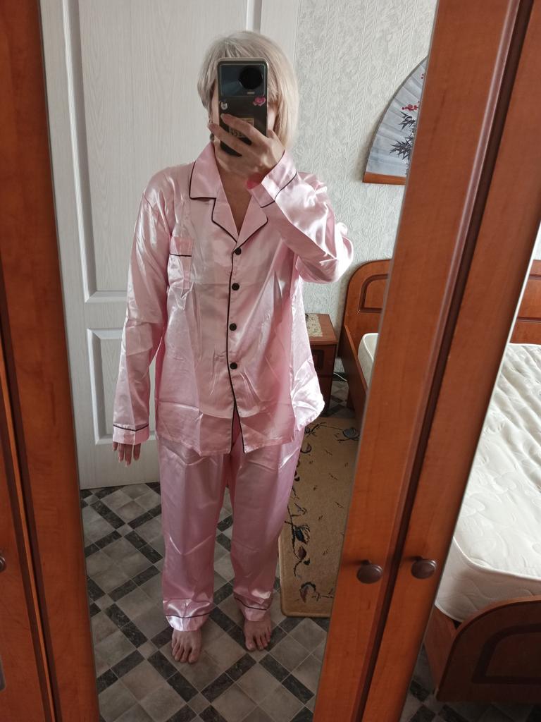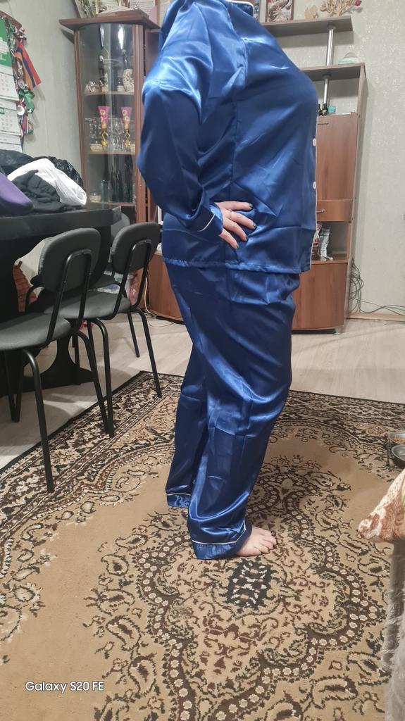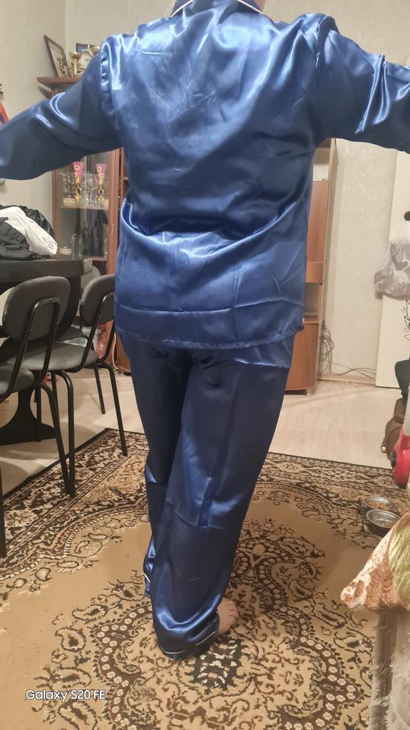 The pants are huge, they will fit well only if pulled up to the armpits, and the jacket has 🦾narrow sleeves, the arms are very cramped in them, and this is not satin, but acetate silk ☝️ the fabric is much thinner than satin and not as durable.