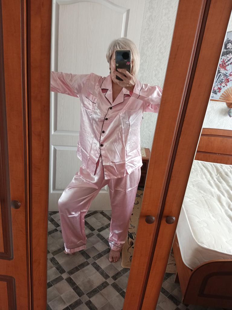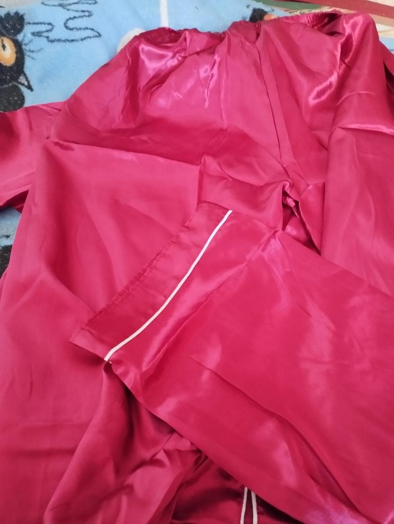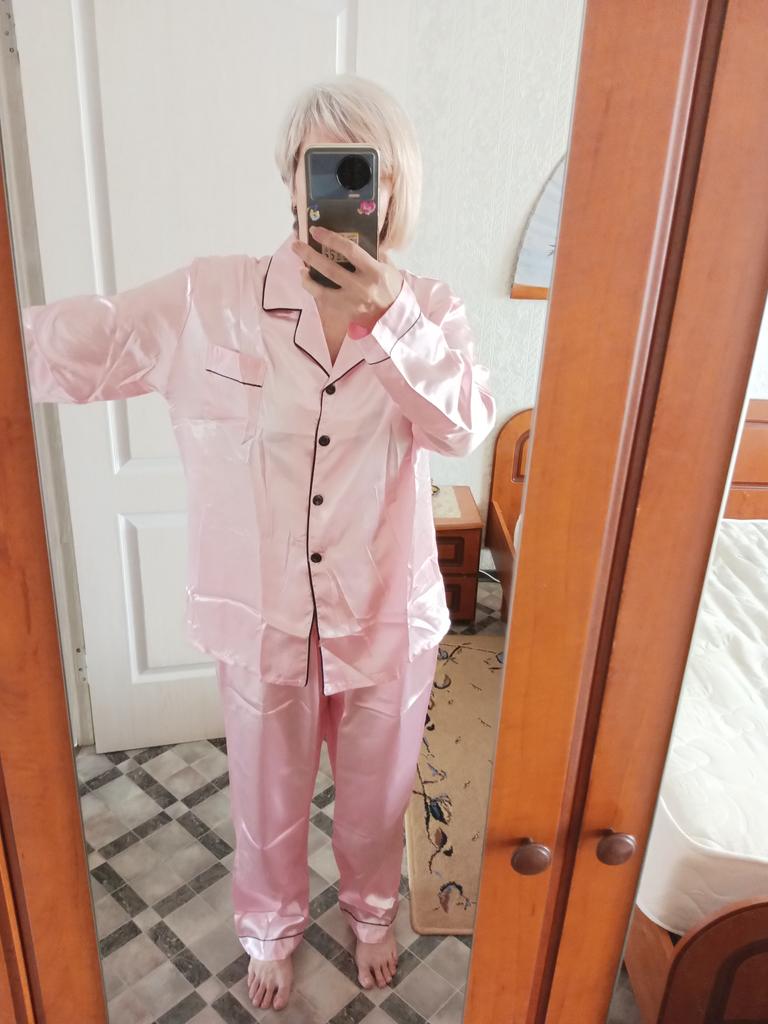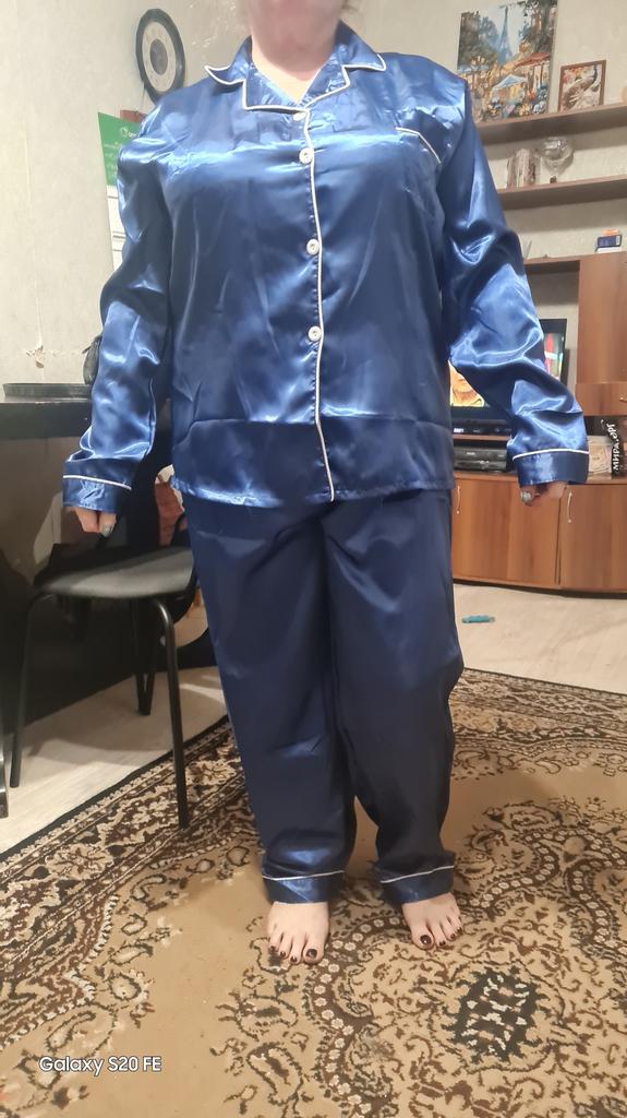 The pants are huge, they will fit well only if pulled up to the armpits, and the jacket has 🦾narrow sleeves, the arms are very cramped in them, and this is not satin, but acetate silk ☝️ the fabric is much thinner than satin and not as durable.
