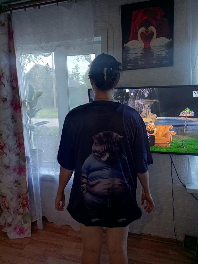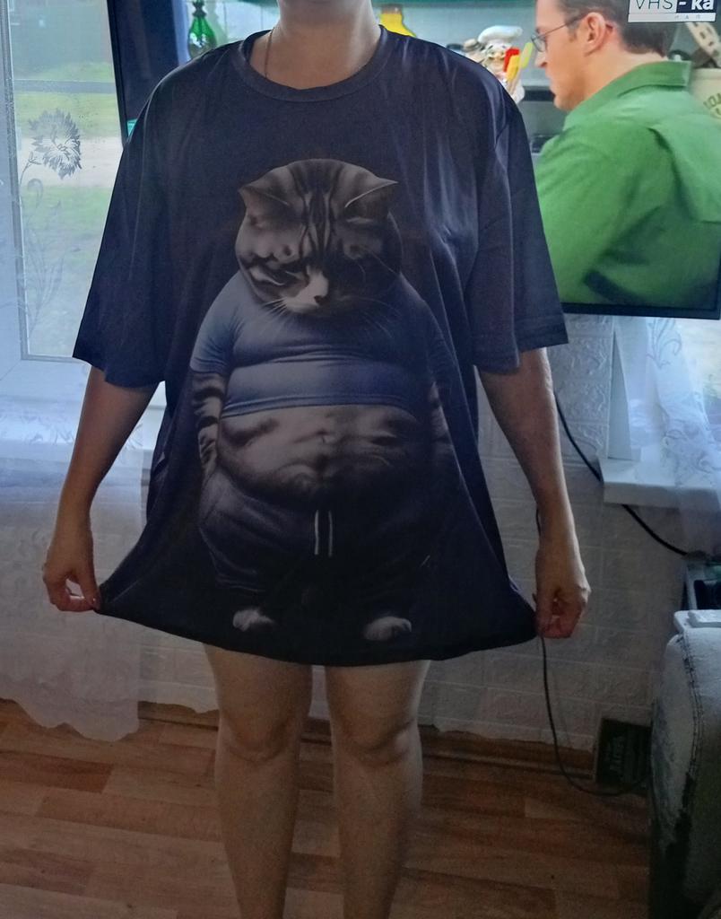 Normal t-shirt. Only the print of the pot-bellied cat on the stomach looks right in place, but what's it for on the back? The same cat, but view from the back, would look great on the back, but since they didn't think of doing it that way, it would be better not to slap any print on the back at all.