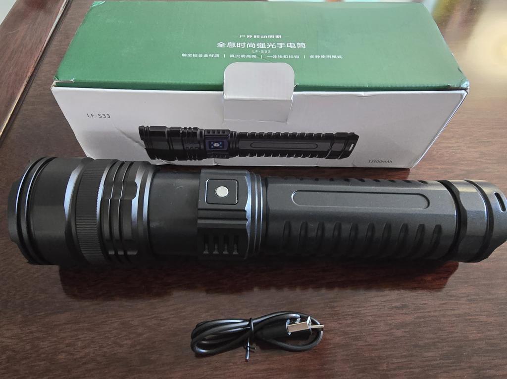 The flashlight is just the bomb, bright, the beam hits very far and is also adjustable closer/farther, a charging cord is included. Packed well, in a box and a bag. Thank you for the quality product.