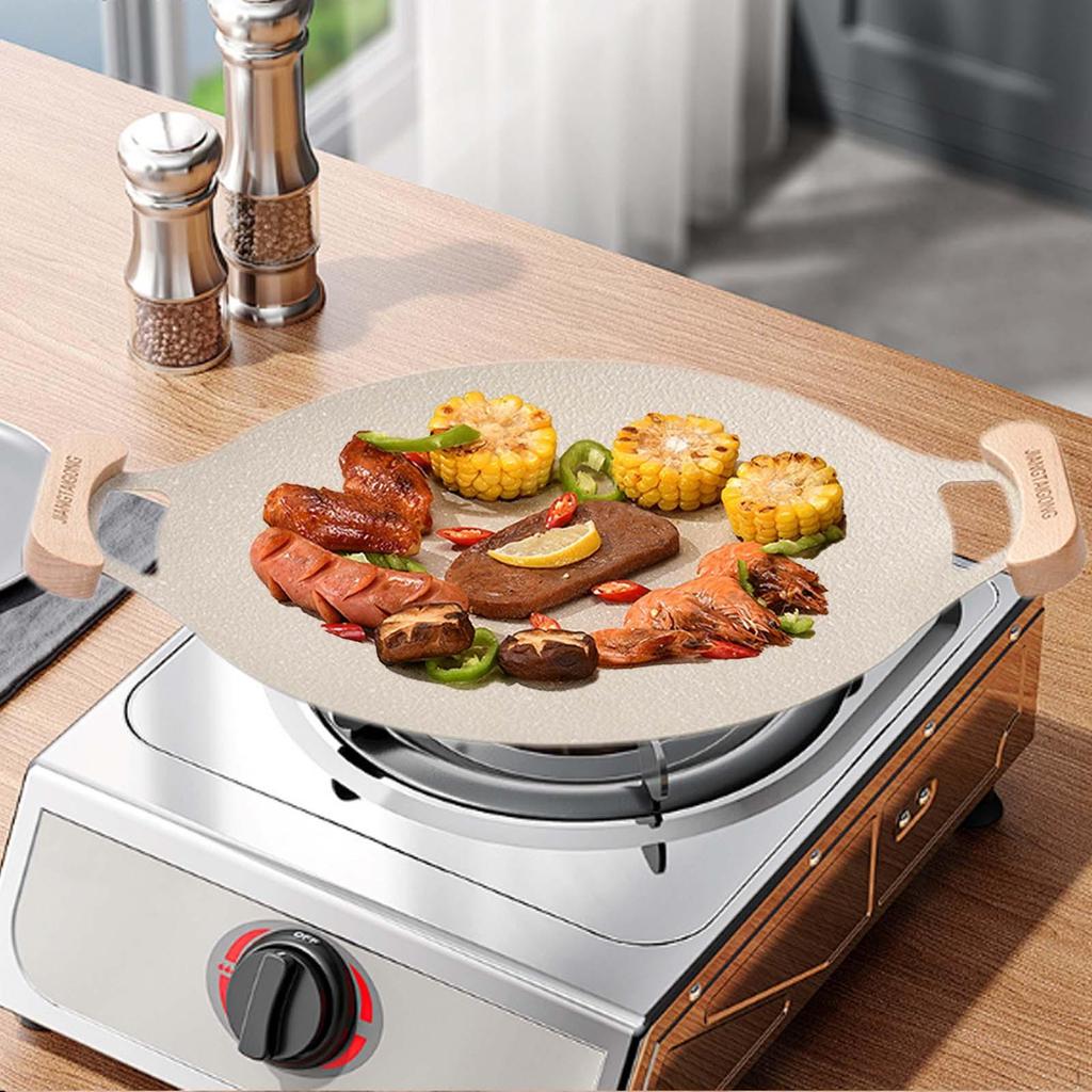- 【Non Stick】: The round barbecue plate has a non stick coating surface that makes it easy to clean. It also comes with double handles for convenient gripping.