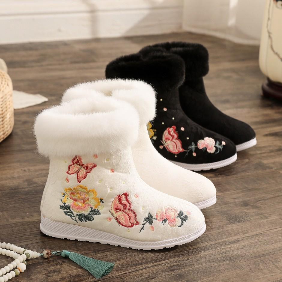 Winter Warm Ankle Boots for Women Casual Anti Slip Plush Fleece Lined Snow Boots With Side Zipper Women's Embroidered Faux Fur Lined Short Booties