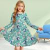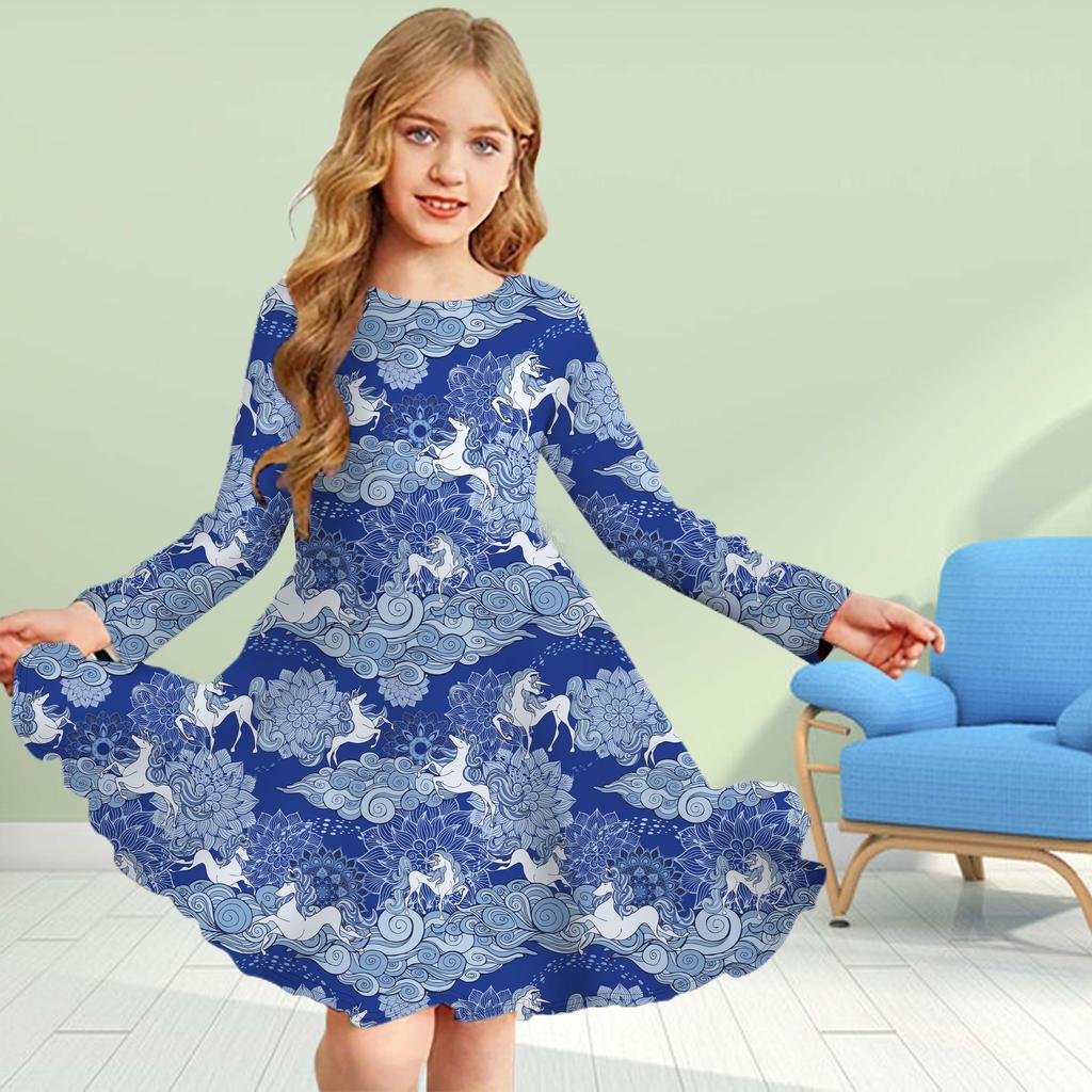 Girl Casual 3D Print Flower Unicorn Round Neck Long Sleeve Dress Kid Princess Dress