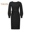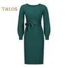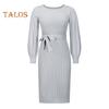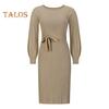 Autumn Lady Dress Knitted Round Neck Long Sleeves Slim Fit Pleated Lace-up Tight Waist Mid-calf Length Elastic Solid Color Midi Sweater Dress