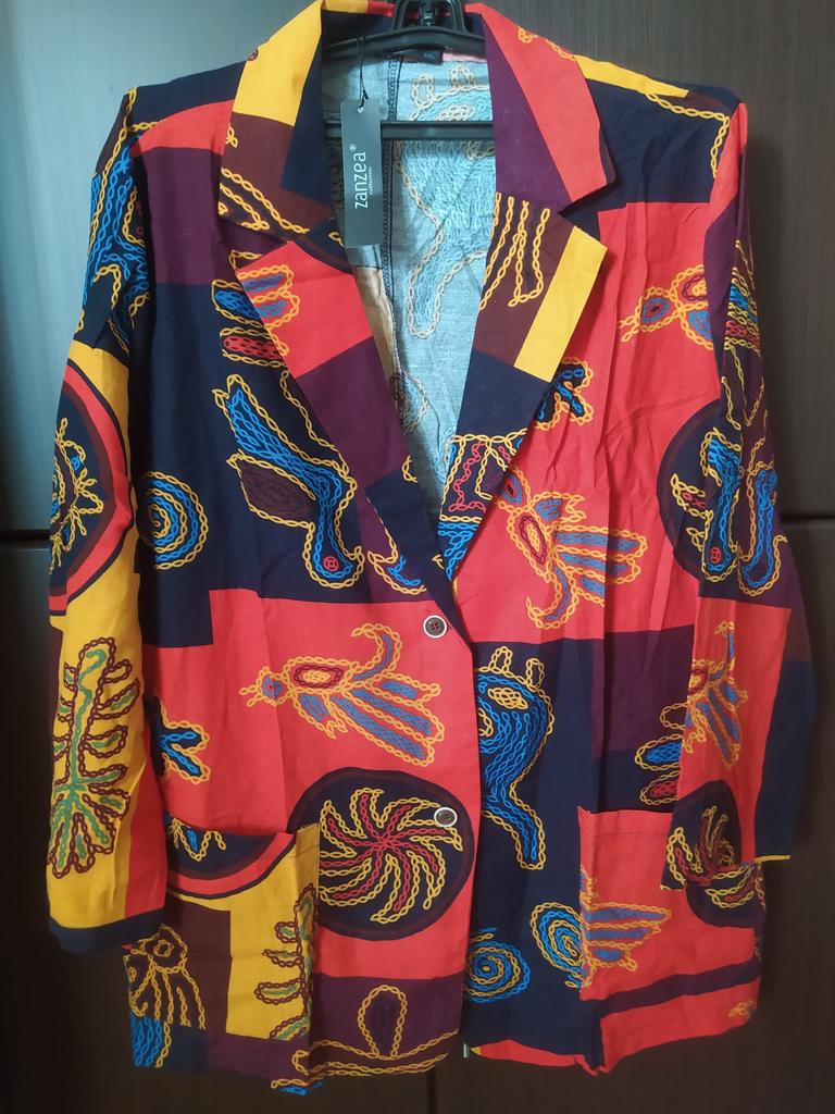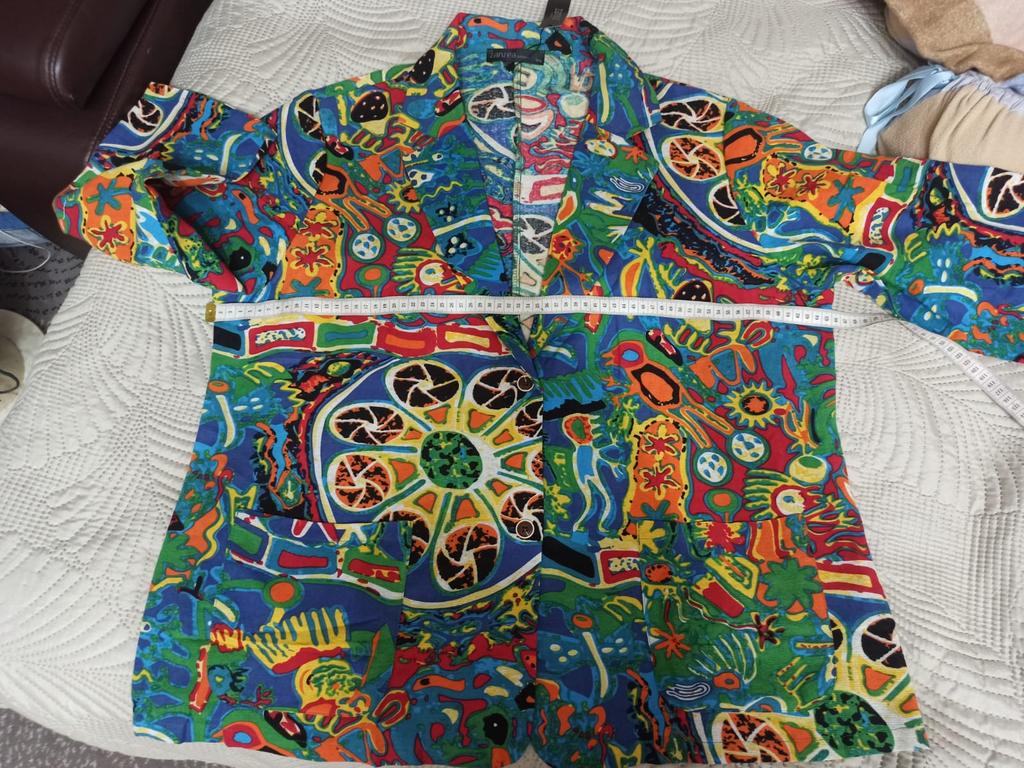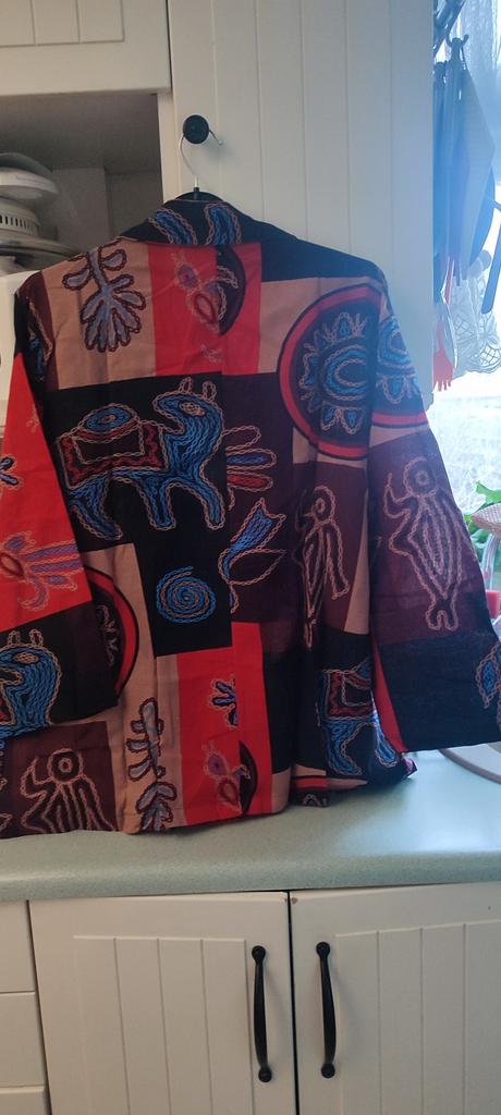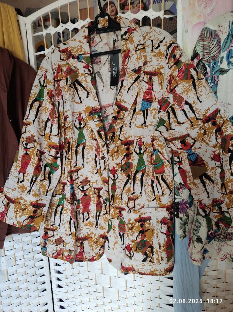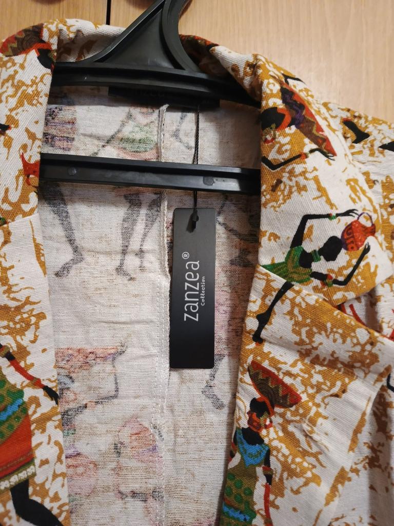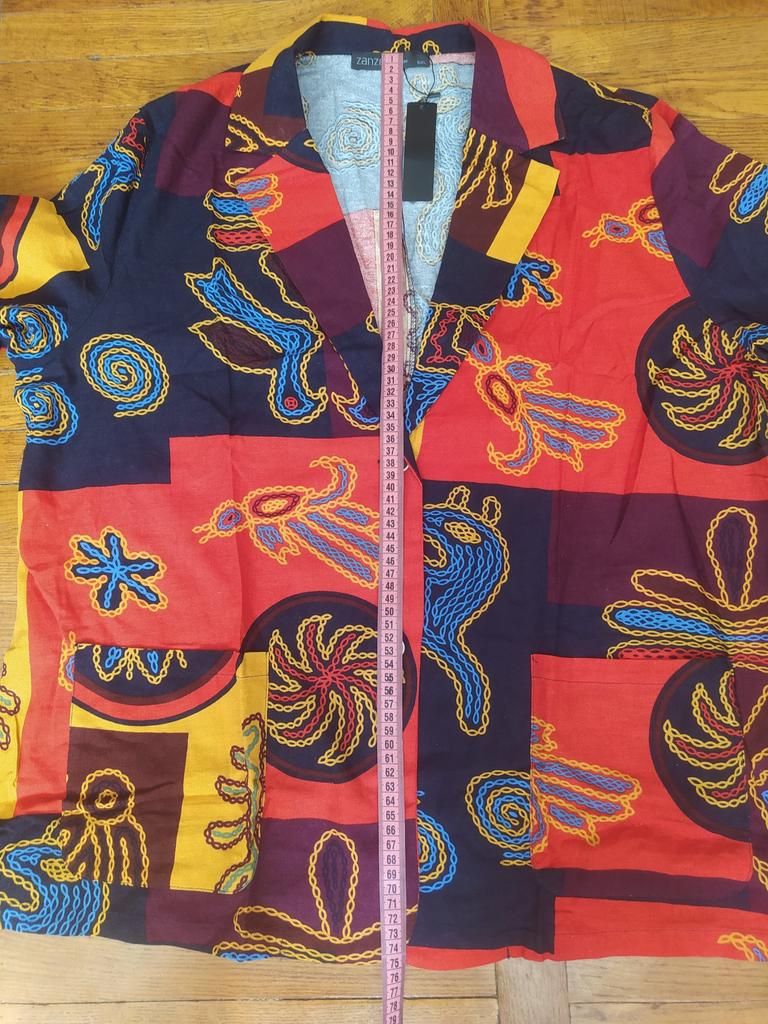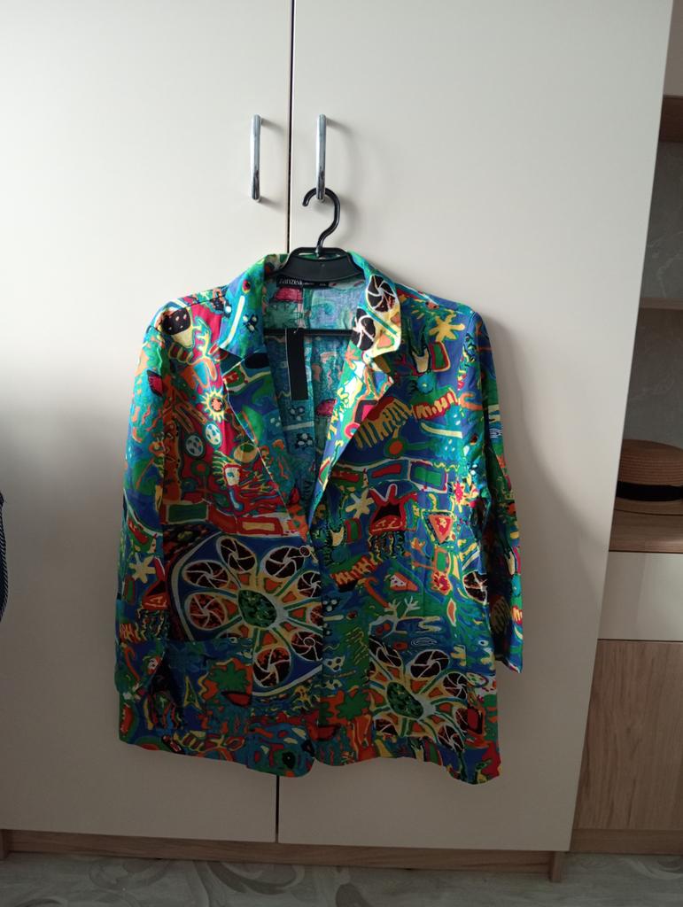 Very beautiful jacket, natural fabric and bright print. The size corresponds to the size range.