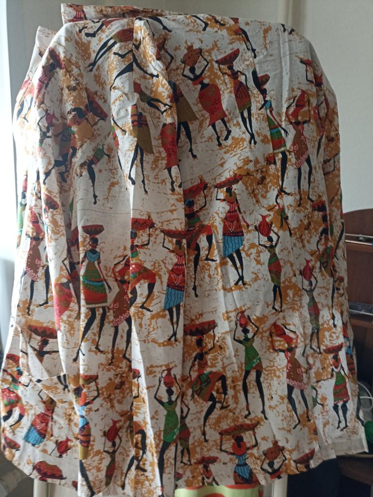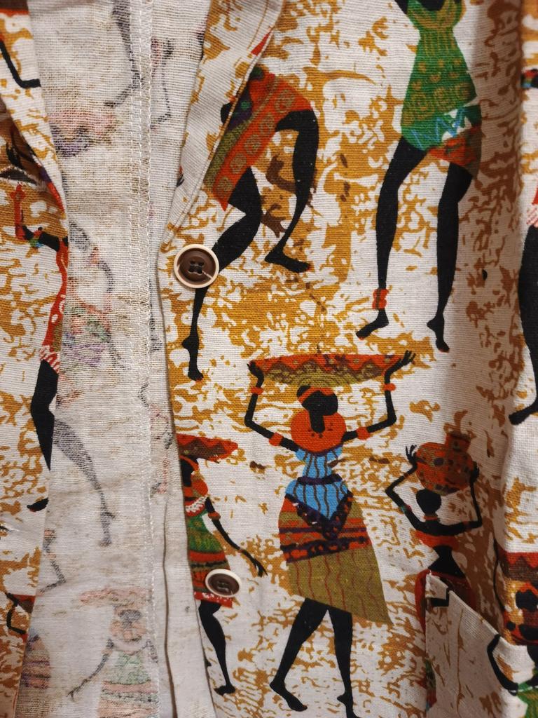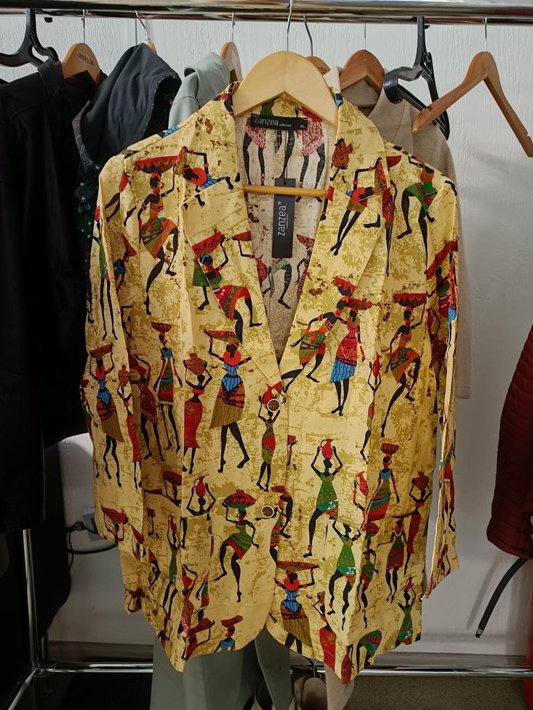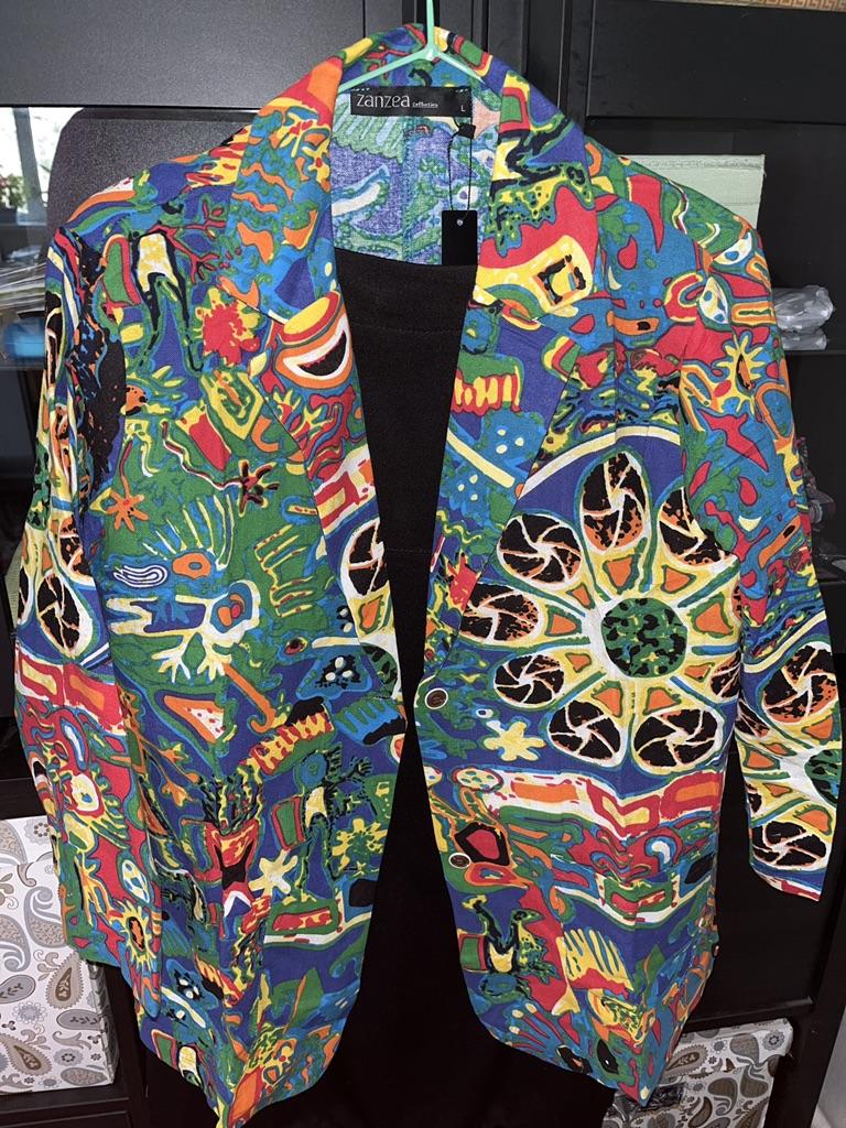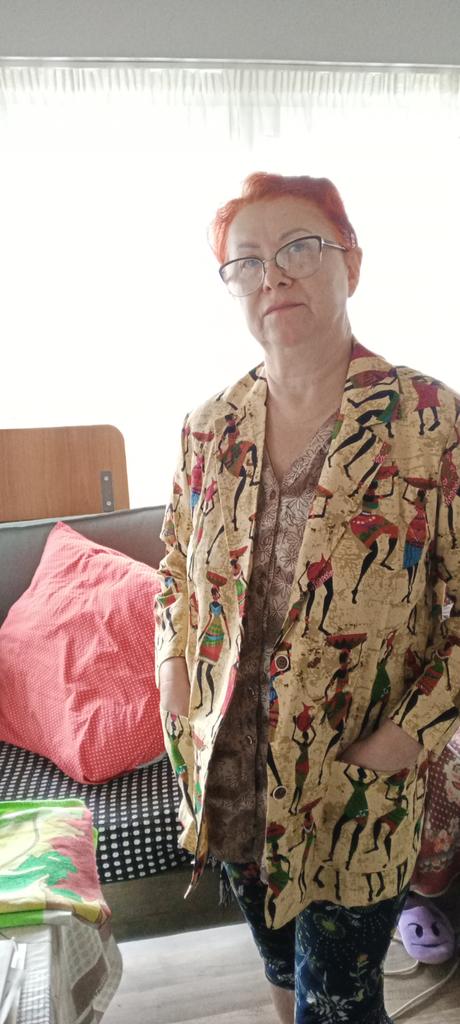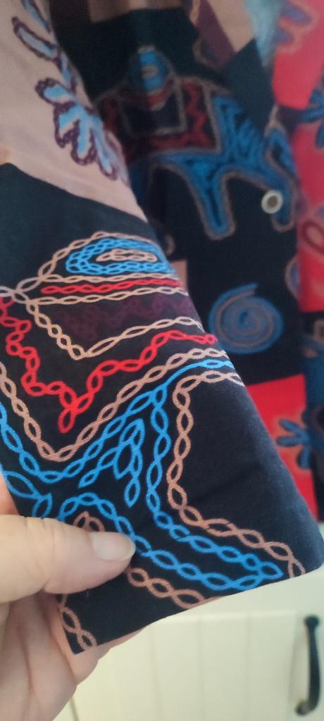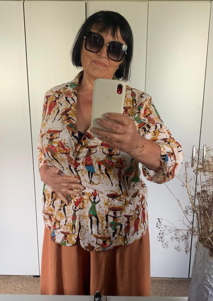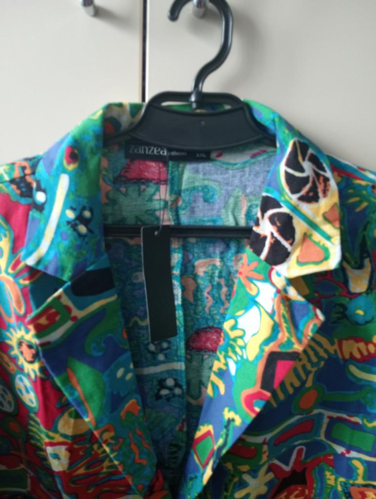 Very beautiful jacket, natural fabric and bright print. The size corresponds to the size range.