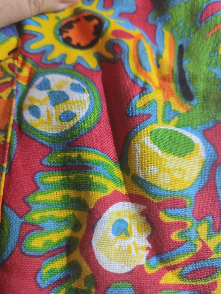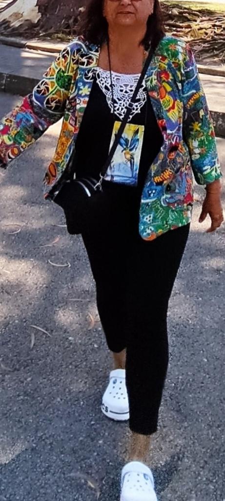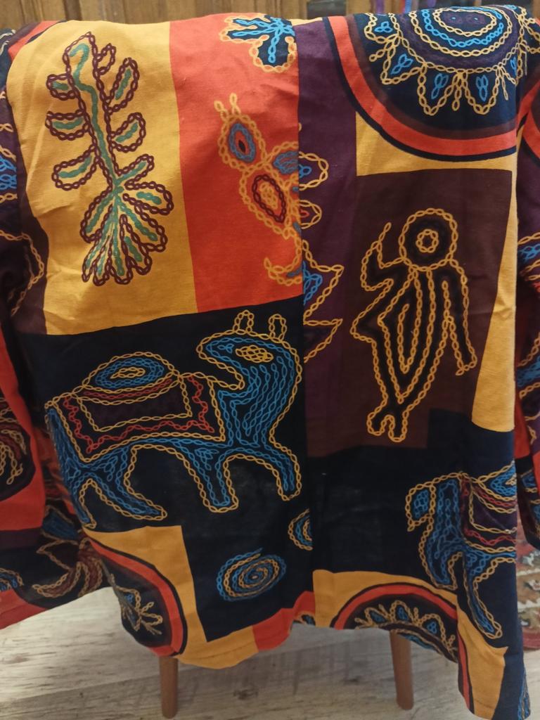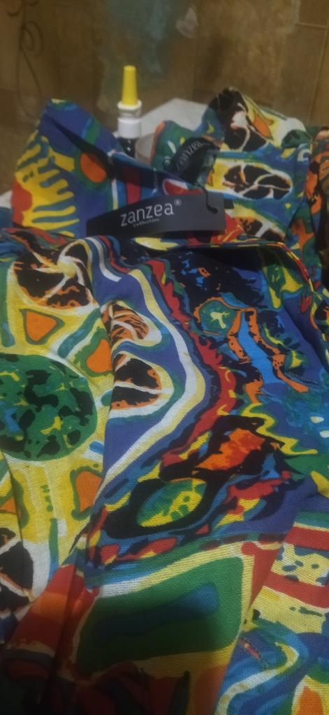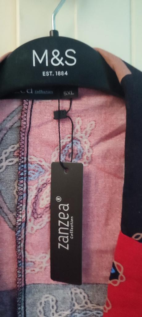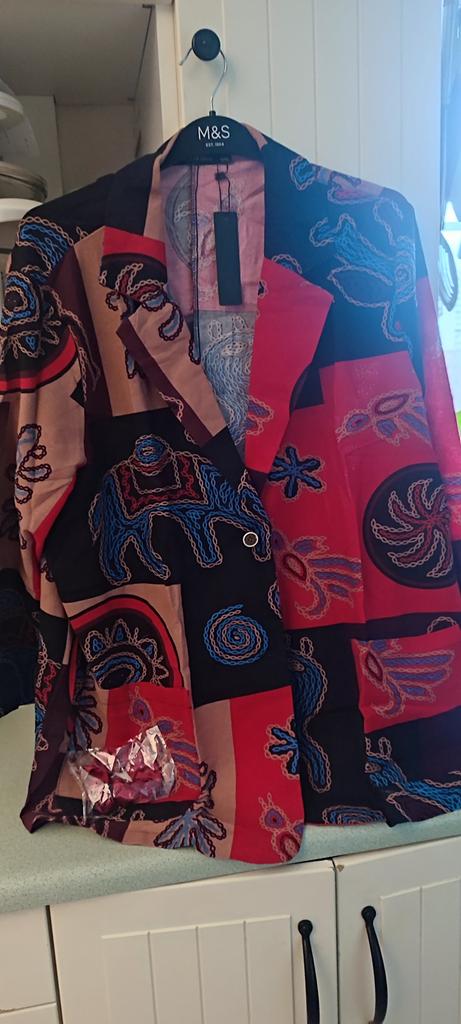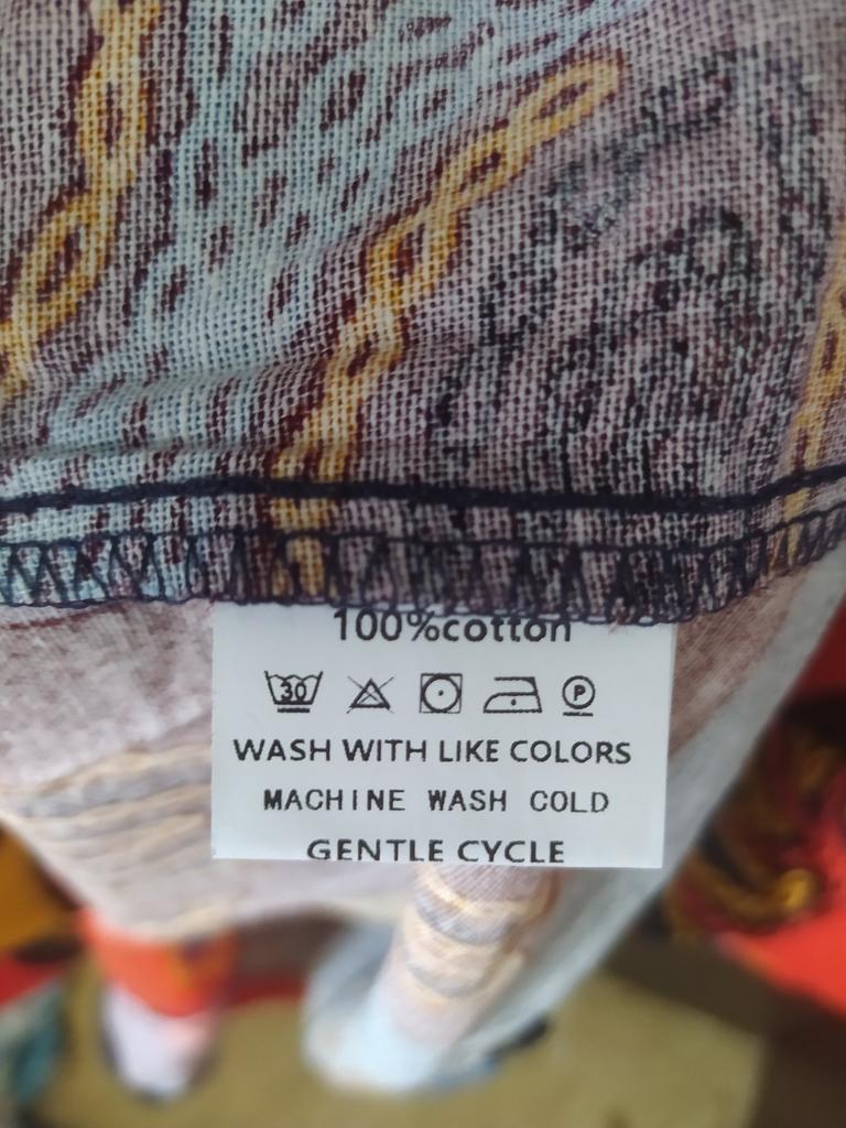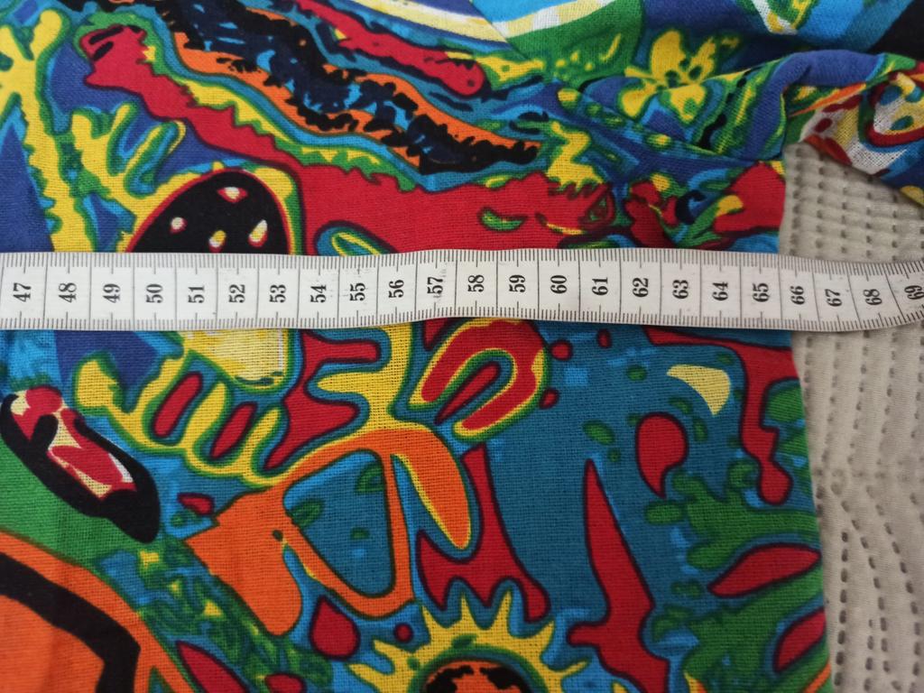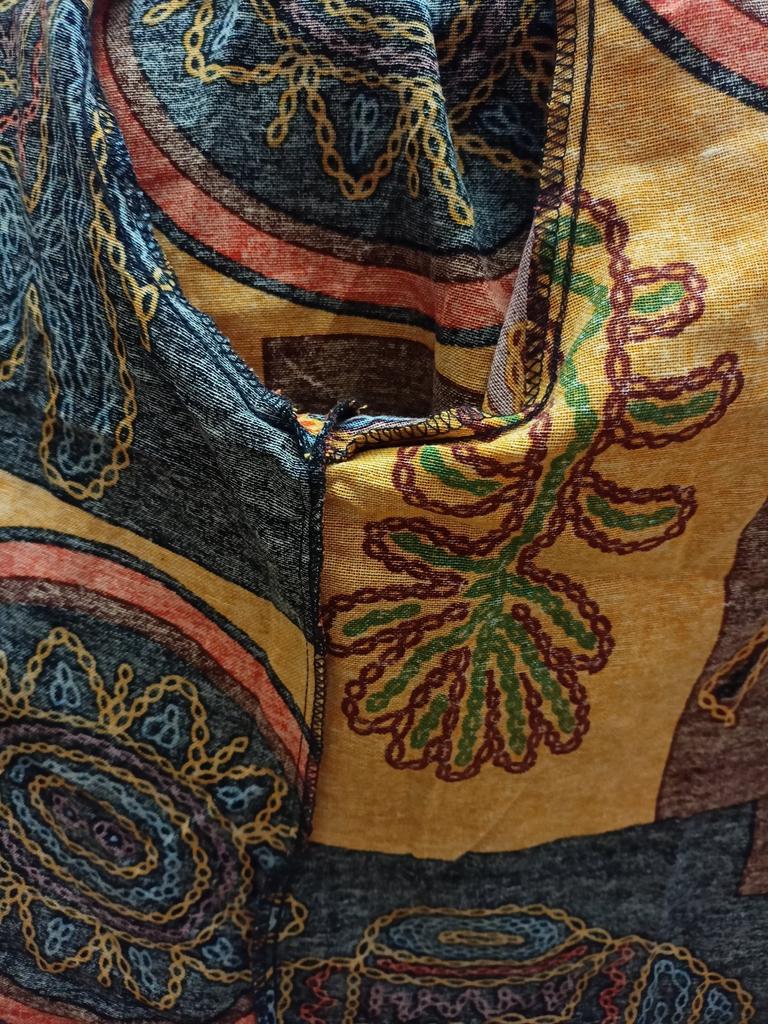 Very beautiful jacket, natural fabric and bright print. The size corresponds to the size range.