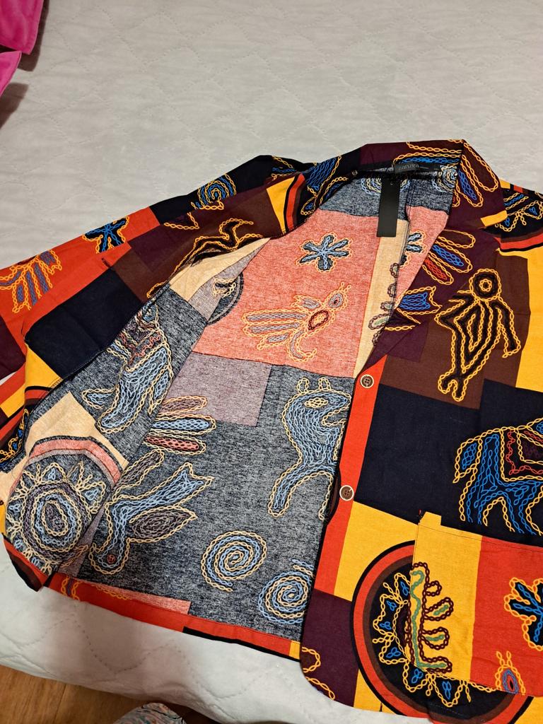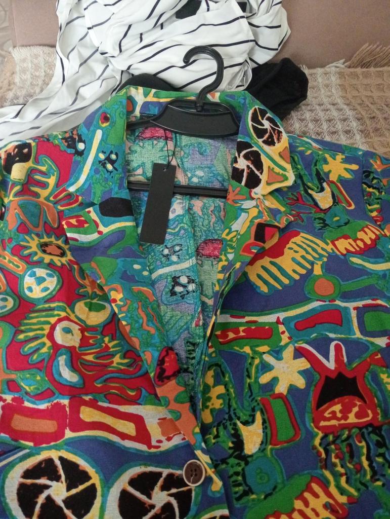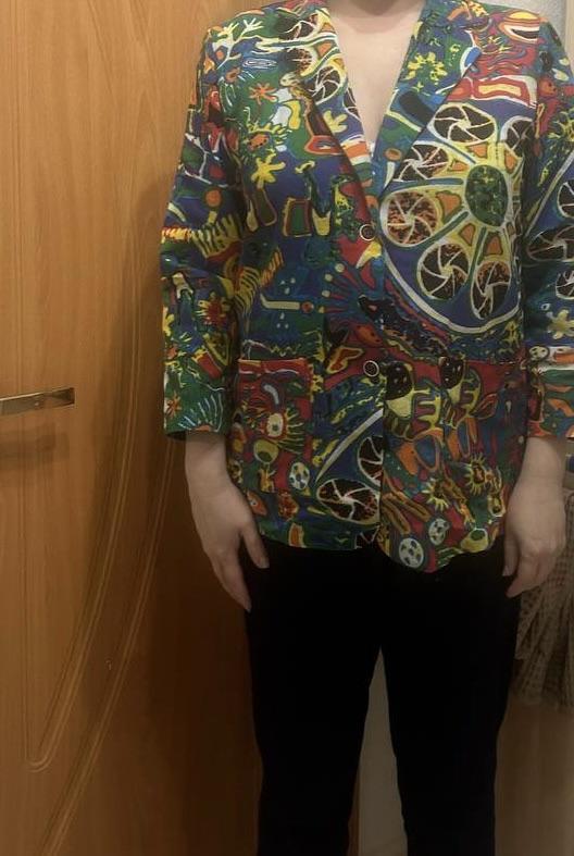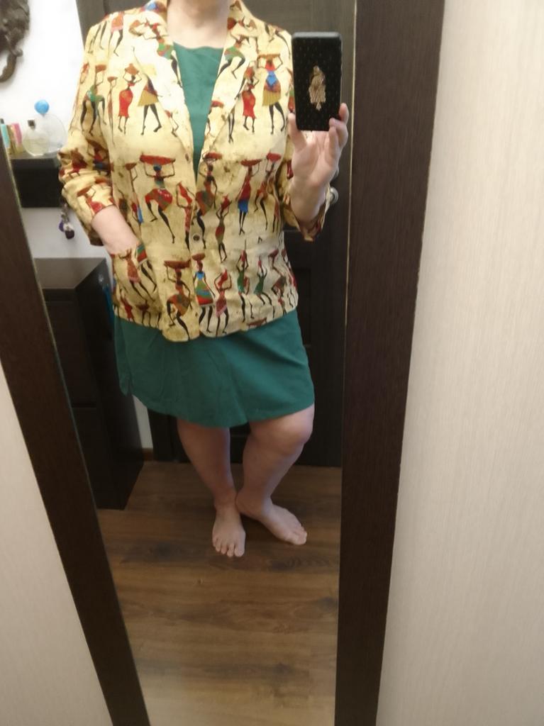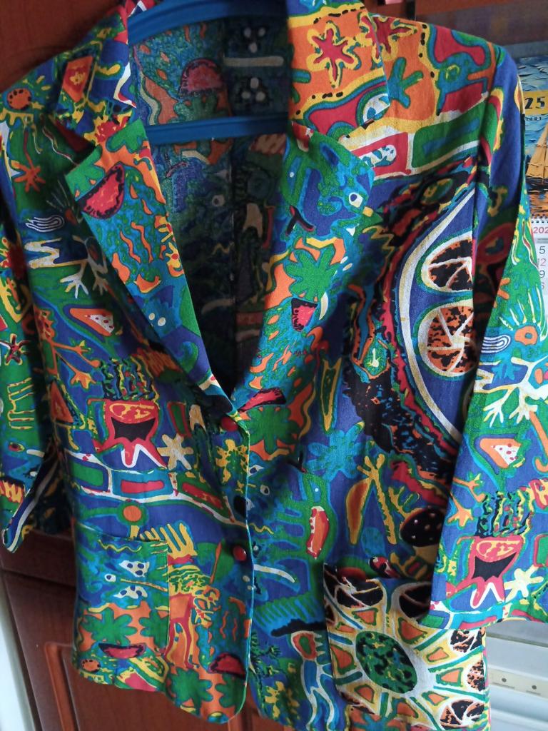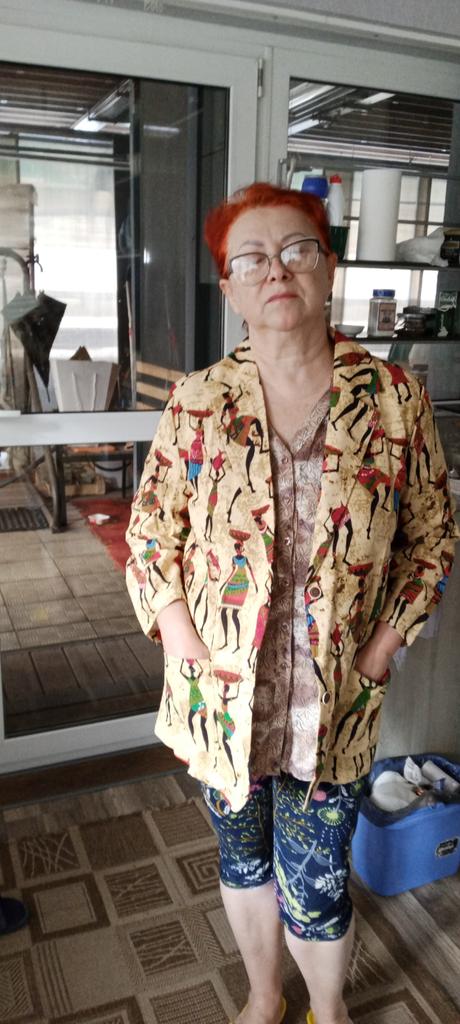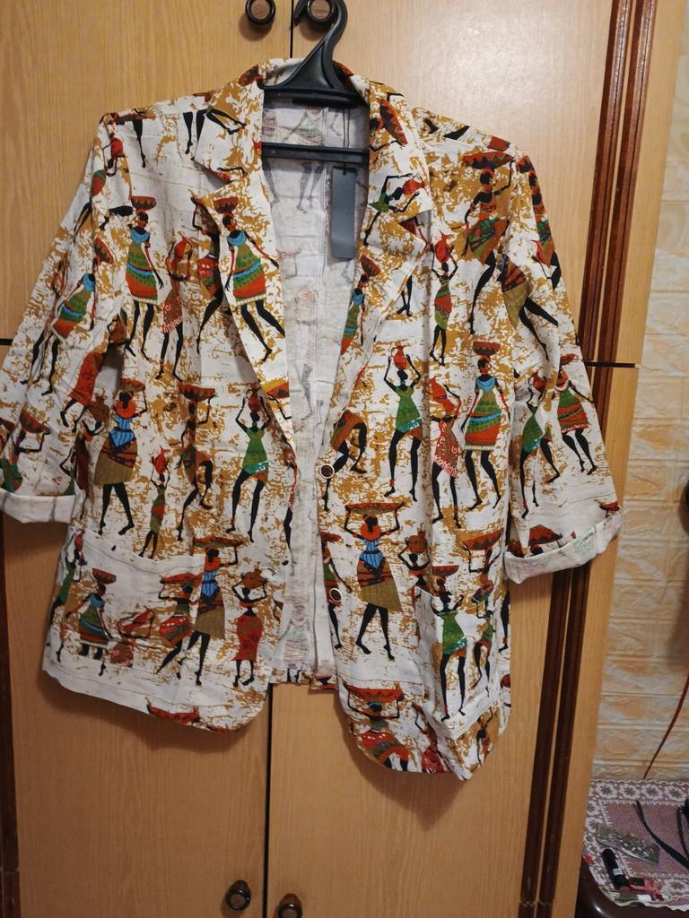 Just a summer jacket, the pattern is bright, matches the photo, the fabric is cotton, but it will need to be adjusted at the waist.