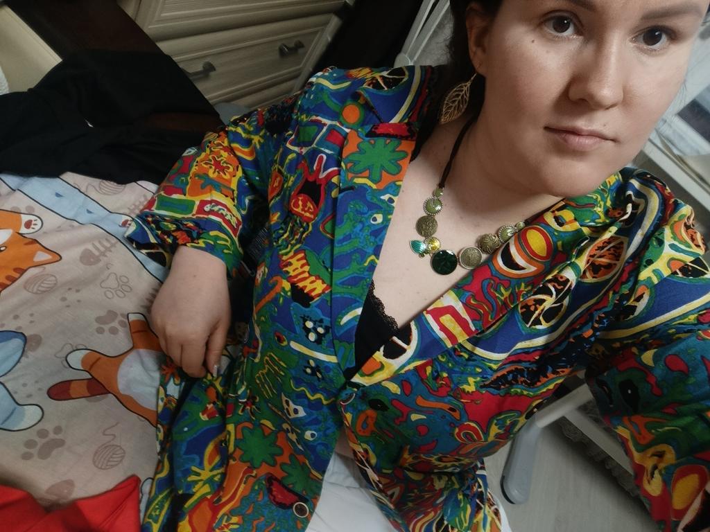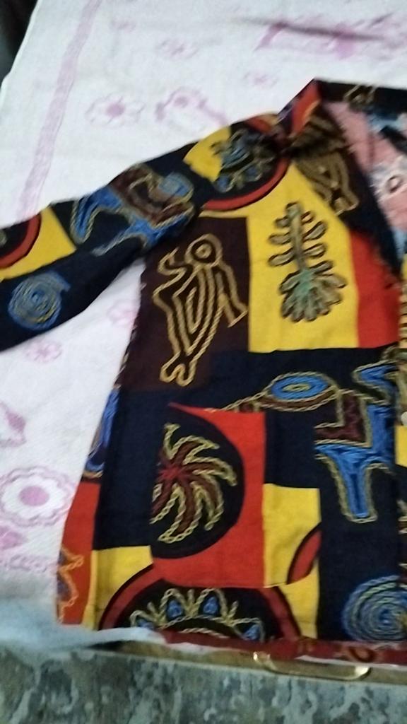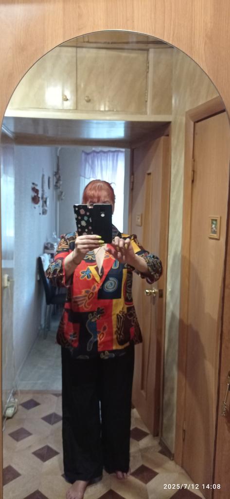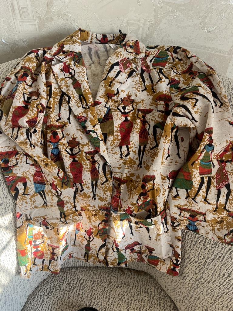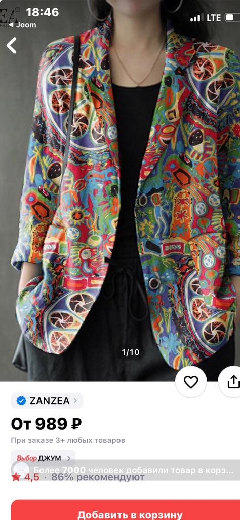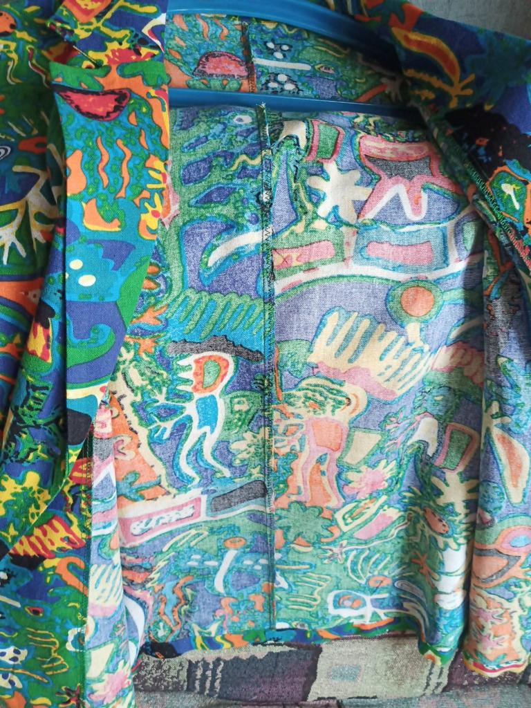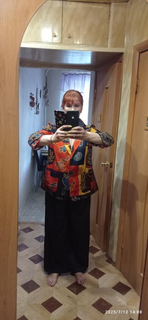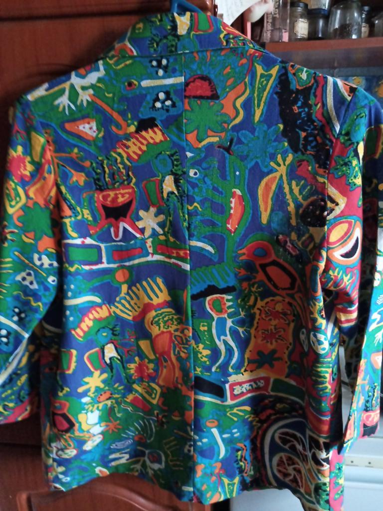 Just a summer jacket, the pattern is bright, matches the photo, the fabric is cotton, but it will need to be adjusted at the waist.