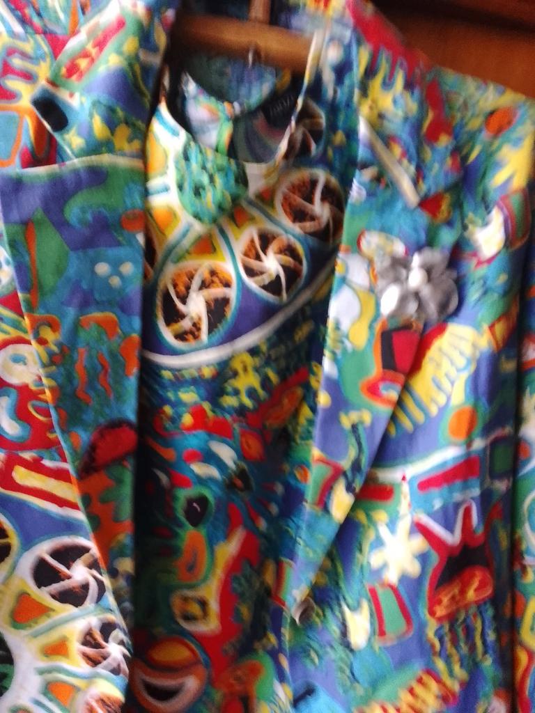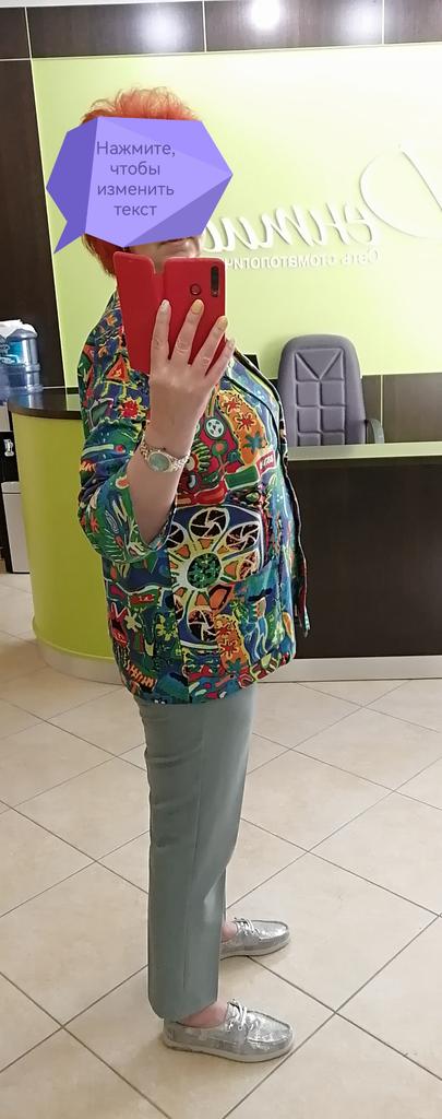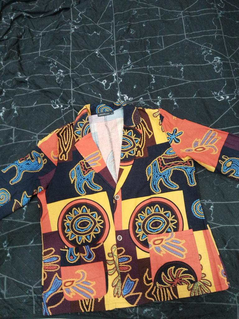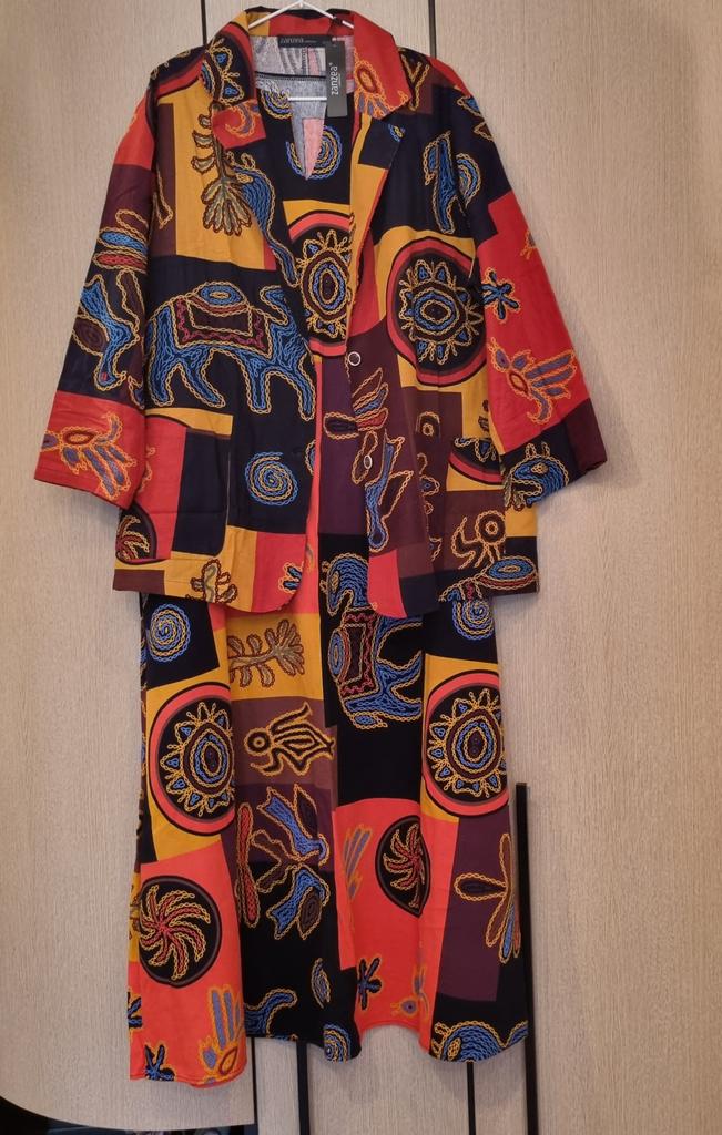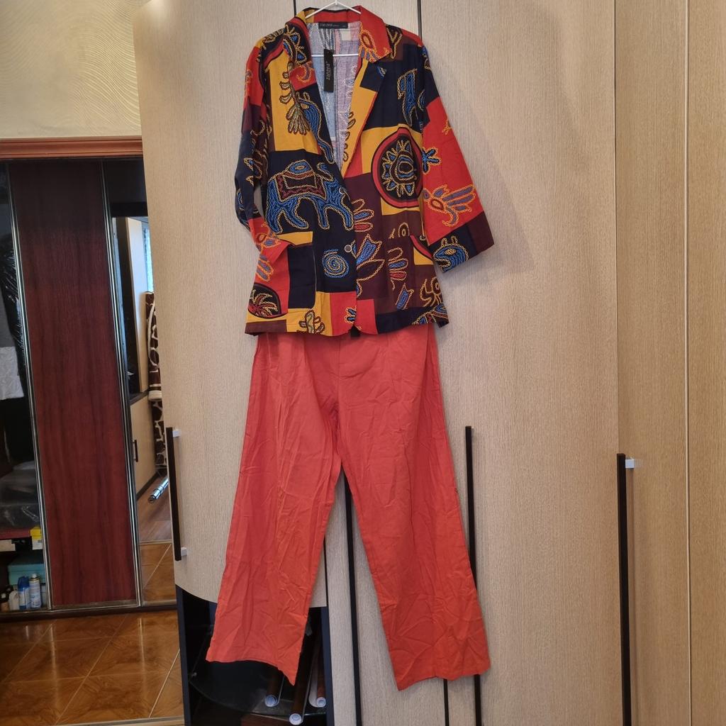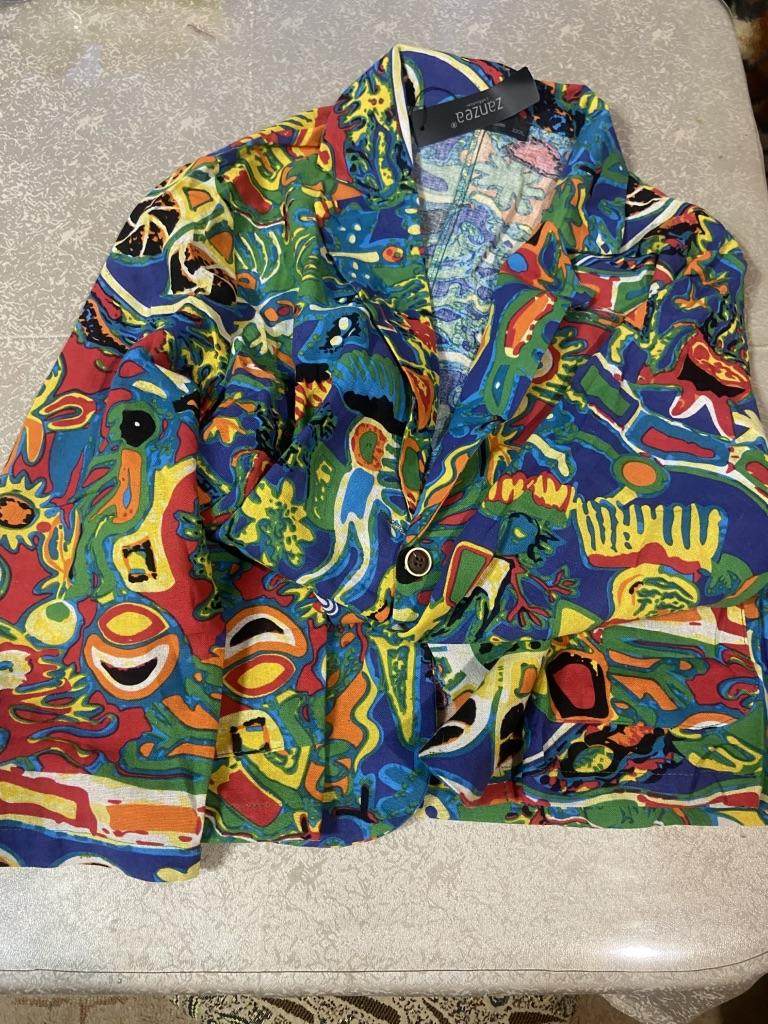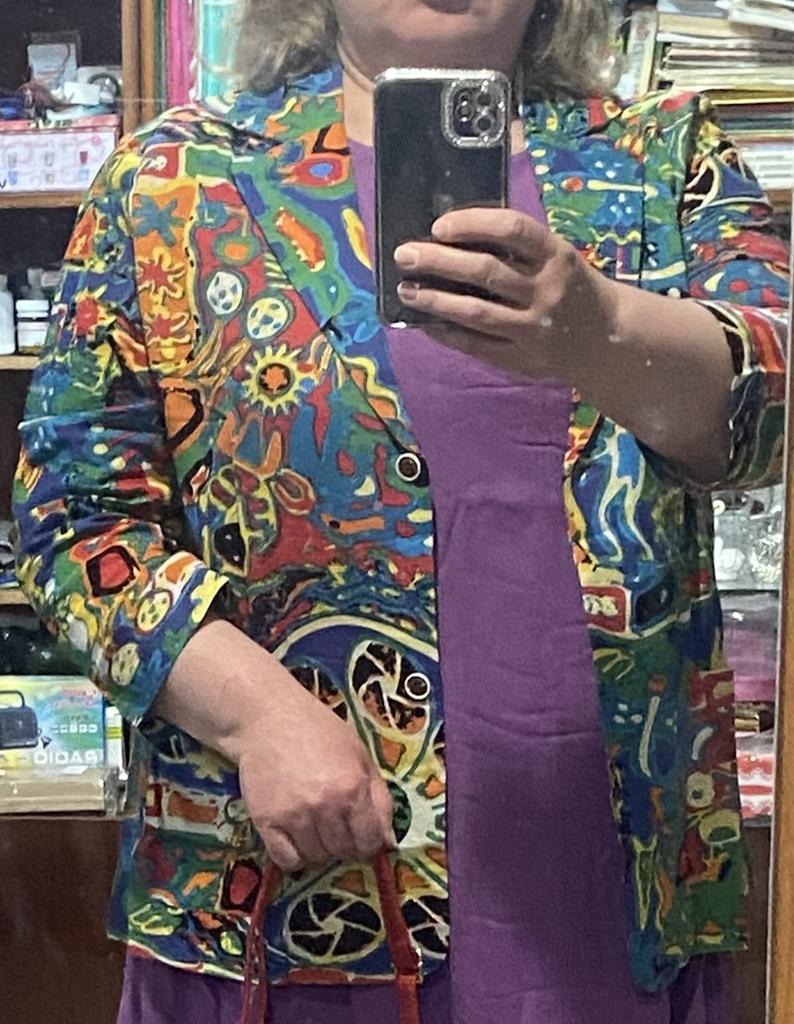Just a summer jacket, the pattern is bright, matches the photo, the fabric is cotton, but it will need to be adjusted at the waist.