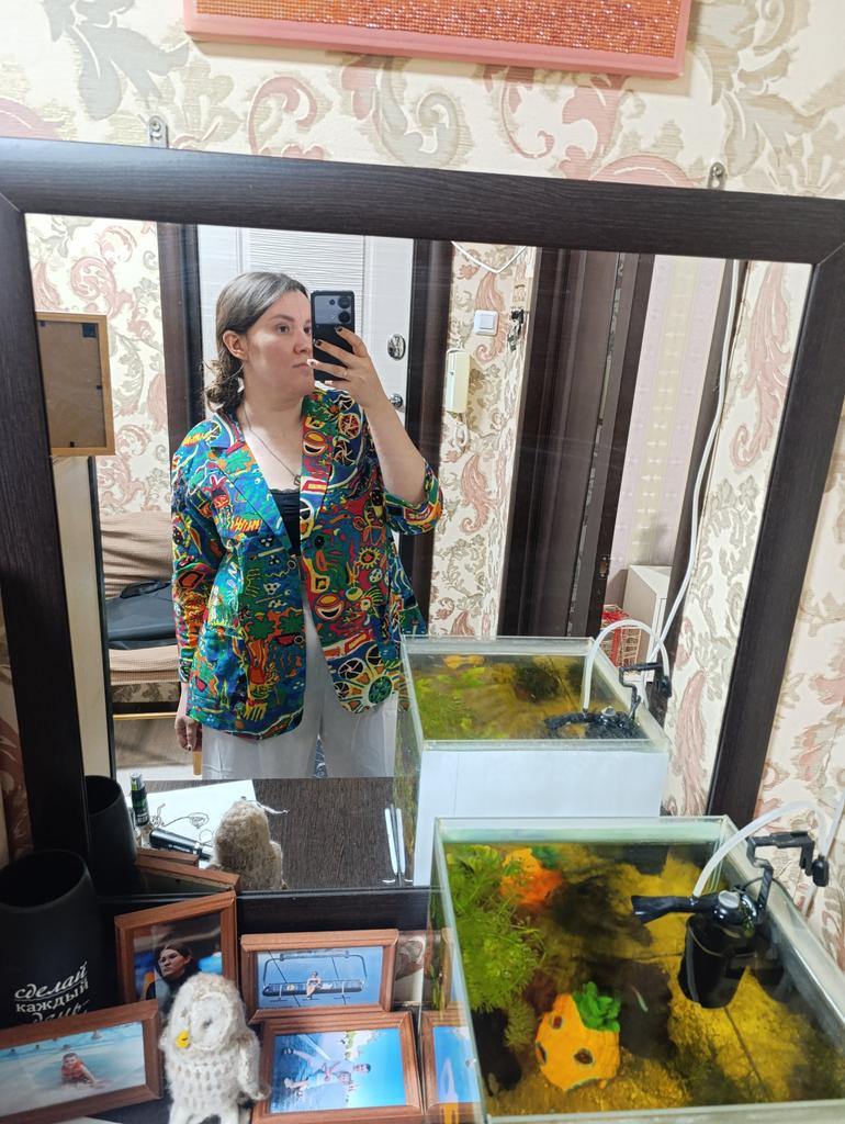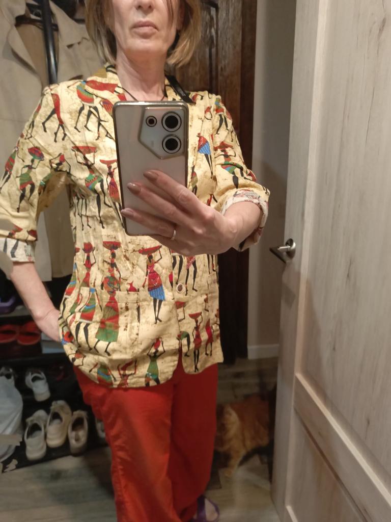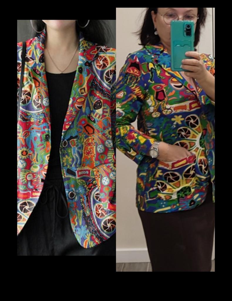 Very wide in the back. Had to alter it, removing fabric along the seam in the center back, so it wouldn't stick out like a sail. Replaced the buttons. Overall well sewn, all fabric edges, even those invisible to the eye, are overlocked. Without distortions.. Sleeve of indistinct length: not full-length, but also not 3/4. I want to roll it up, but then the wrong side of the fabric is on the outside, it's not pretty, the wrong side is pale. There are no cuffs, just a straight tube. Overall satisfied, the jacket is bright, pure cotton, a wonderful summer option.
