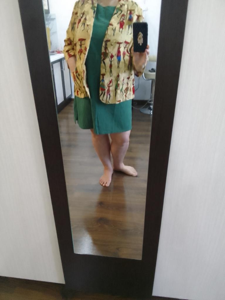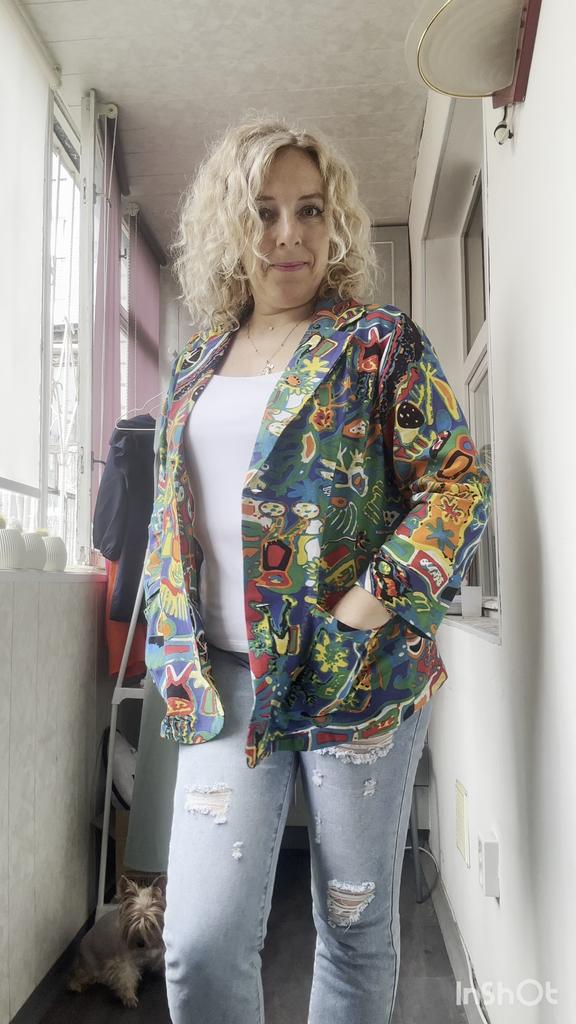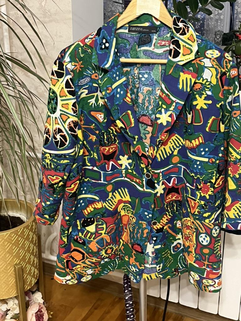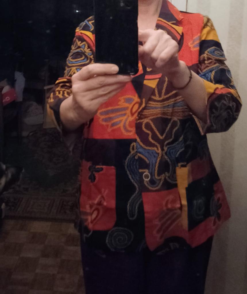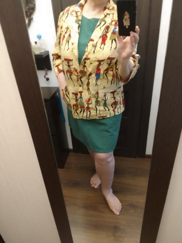 Colorful, a jacket for the summer. No lining. Thin. The main advantage is the natural fabric. Looks stylish, the sleeves are a bit short, but that's appropriate here. Size S is just right.