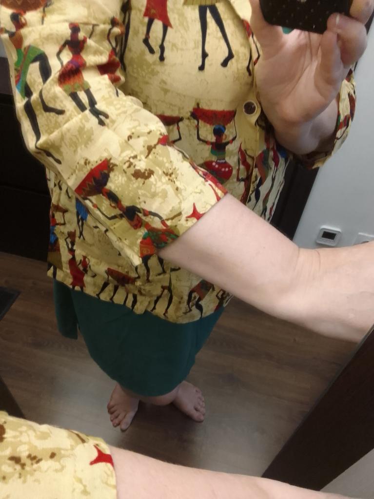 The fabric is good, long, the sleeves are more 2/3 than 3/4, while it's somehow awkward - the top is small, and the bottom is voluminous...