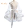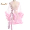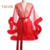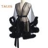 Lady Nightgown Plush Trim Ultra Thin See-through Mesh Ruffle with Adjustable Waist Tie Solid Color Pleated Slutty Pajama Party Wear Sleepwear