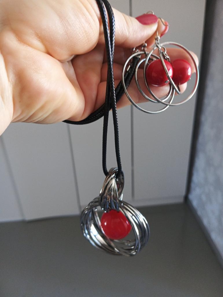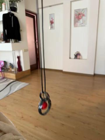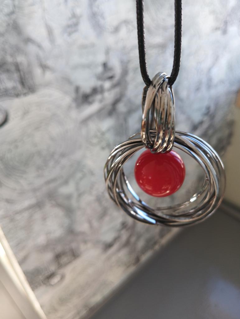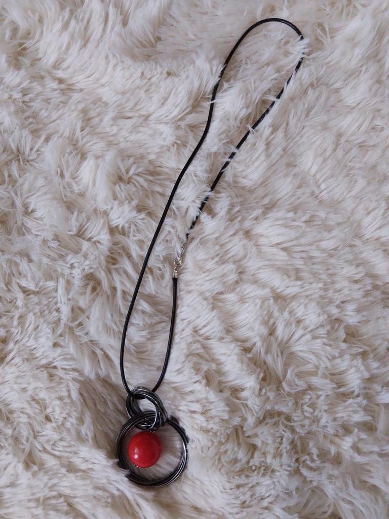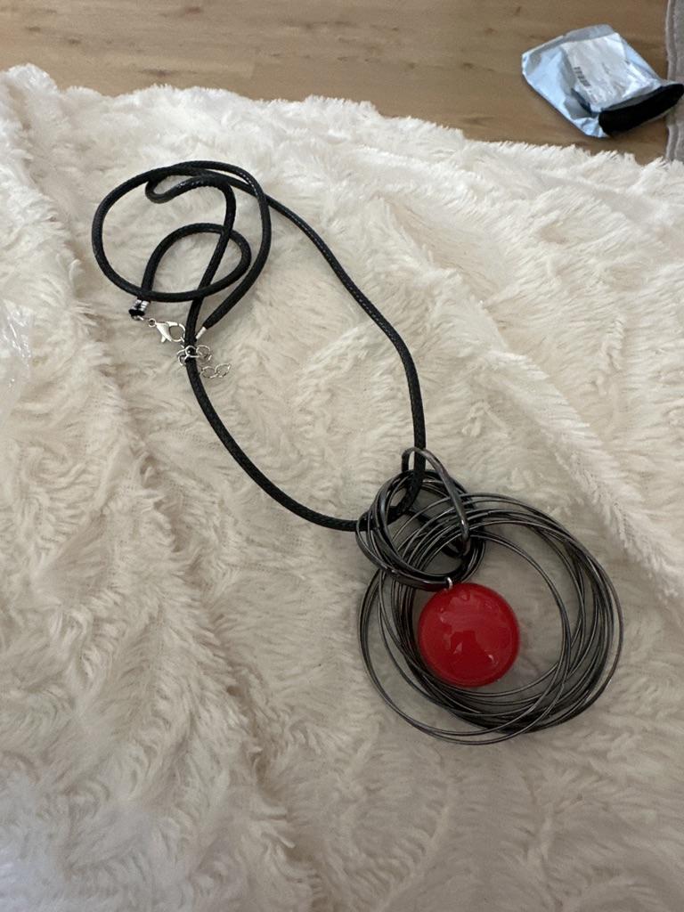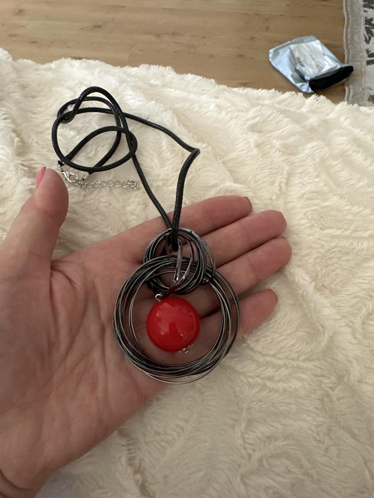 Very cool pendant, metal color is dark gray, red round pendant in the shape of a ball, the ball has weight, the cord is long and leather, cord length 32 cm + additional chain of 10 links.