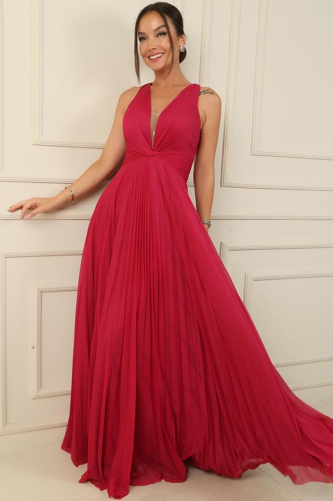 Backless Front Knot Detail Lined Pleated Long Chiffon Evening Dress