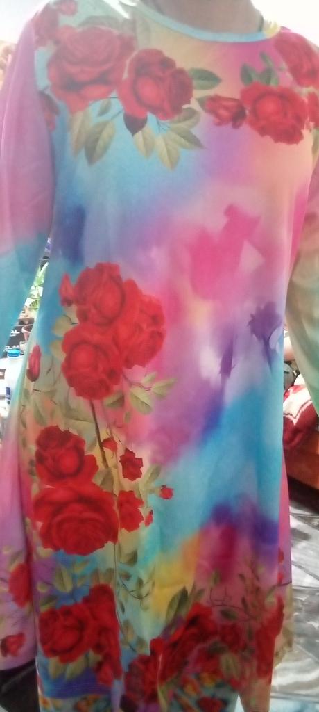 Ordered two dresses - size 110 and 120. The difference is only in length. by 2.5 cm. The waist measurement for both dresses is the same - 50 cm. (25 cm when laid flat) In the photos, the dresses are shown with a full skirt. In reality - it's a pencil pattern to which triangles were added on both sides and cut out. This "extra" material hangs on the sides. The print is colorful, 95% Polyester.