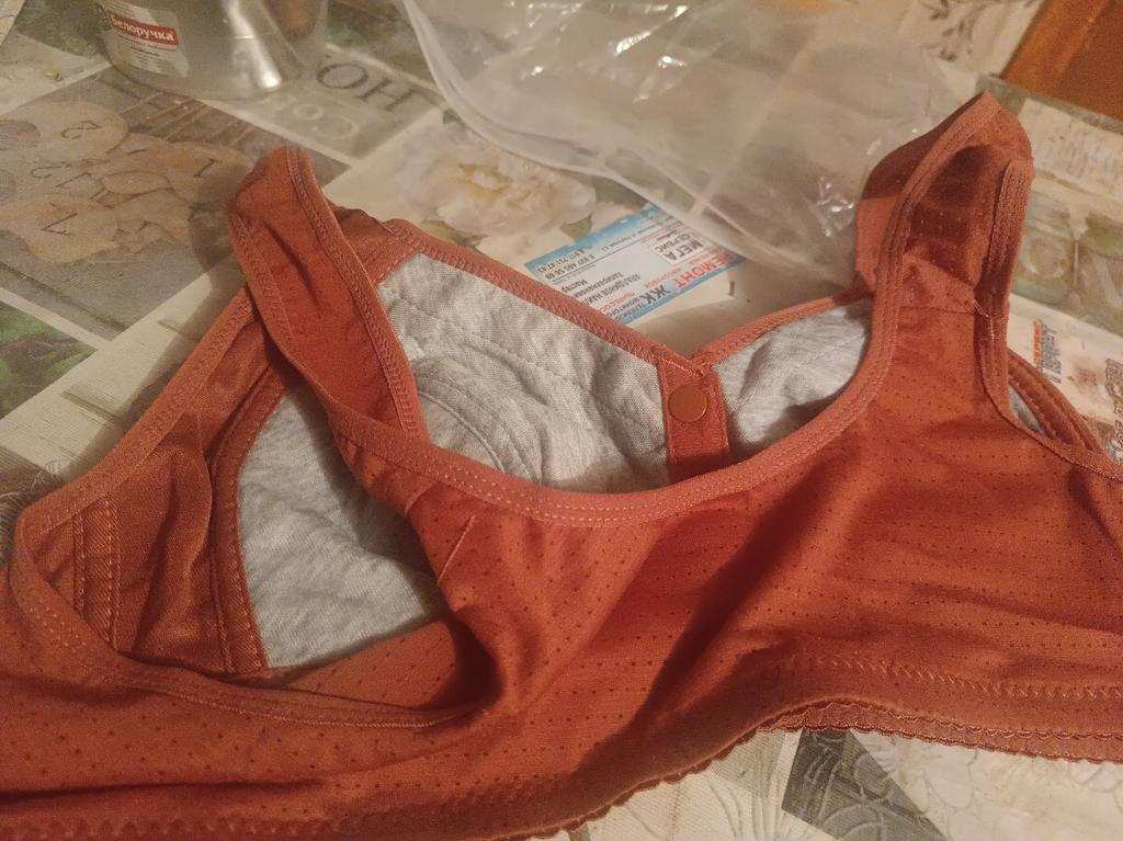 I bought it for my mother, it fastens in the front which is convenient for her, the bra is made of stretch knit... at first the cups were a bit tight, but by the end of the day they took the shape of the breasts, while the part that goes across the back also stretched a bit. We ordered a size smaller.