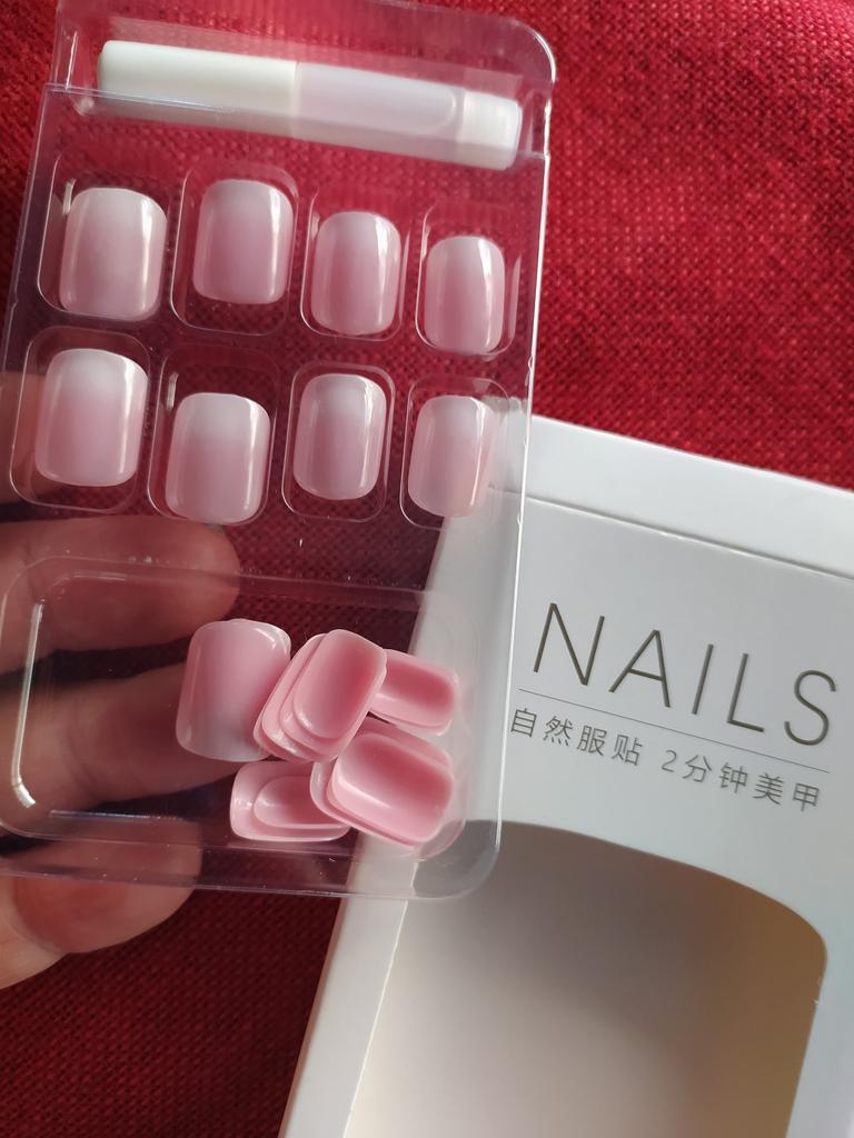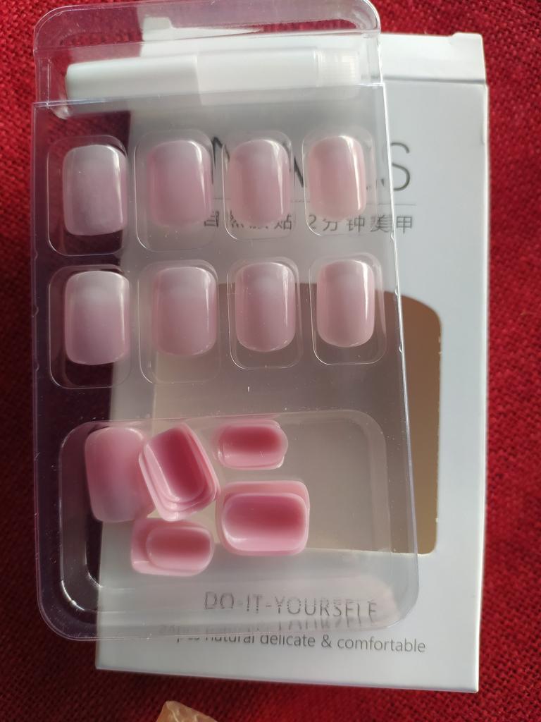 Plain nails that need to be glued on. The color is a bit dark, I didn't guess right.